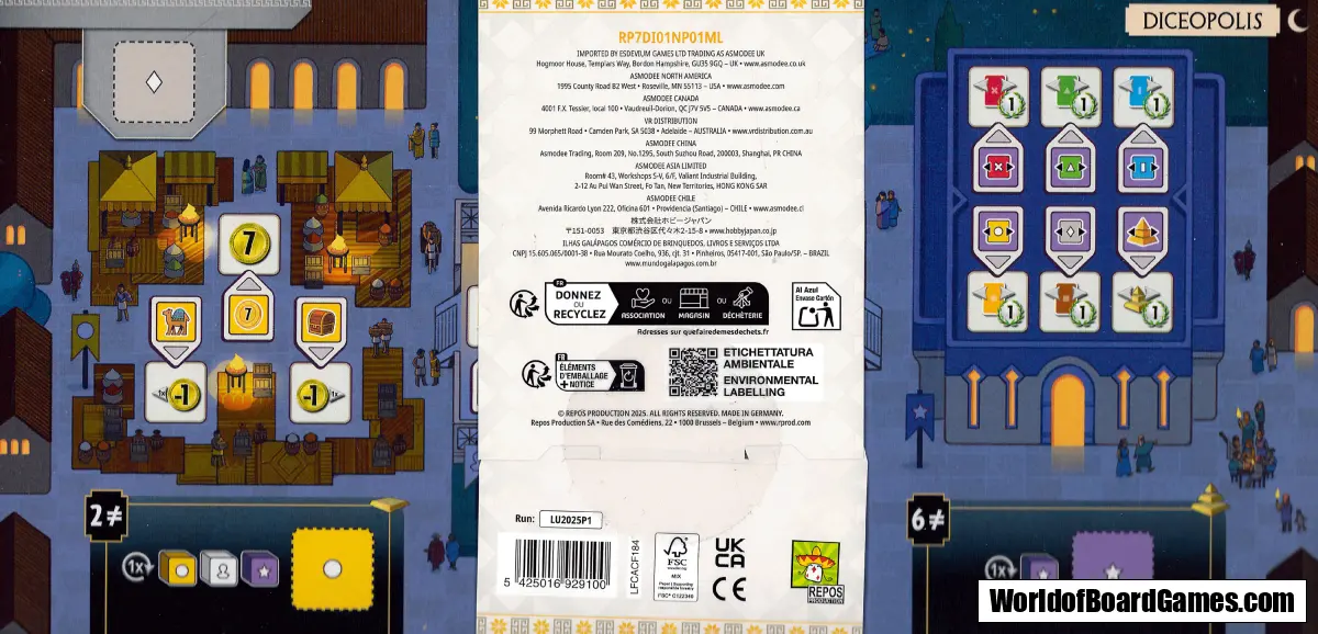 Each stage of Diceopolis is built using any combination of resources, while its powers come from the dice you roll and place on its board. At the start, you roll three Grey dice to determine your city’s founding resource. As you progress, you roll and assign colorful dice - Green, Blue, Red by day, and Yellow, White, Purple by night - unlocking their unique effects to shape your civilization’s growth. Diceopolis turns the familiar 7 Wonders flow into a lively, ever-changing contest of strategy and chance.