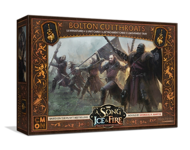 The A Song of Ice and Fire: Tabletop Miniatures Game Bolton Cutthroats unit box comes with everything needed to add these sneaky troops to your army, including 12 Bolton Cutthroats miniatures in four different sculpts, one Dreadfort Captain Unit Attachment figure, a Movement Tray, and all the associated Unit cards. These warriors are mercenaries with no loyalty to any House, so no matter what army your fielding, they’ll join your ranks… for a price!