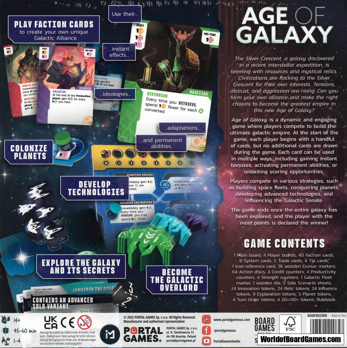 I Age of Galaxy väljer du bland över 30 unika fraktioner, som alla erbjuder olika förmågor och strategier. Du kan integrera fraktioner i ditt imperium för långsiktiga fördelar – eller offra dem tillfälligt för kraftfulla engångseffekter via avtalskort. Balansen mellan kortsiktiga vinster och långsiktig uppbyggnad är central för spelets taktiska djup.