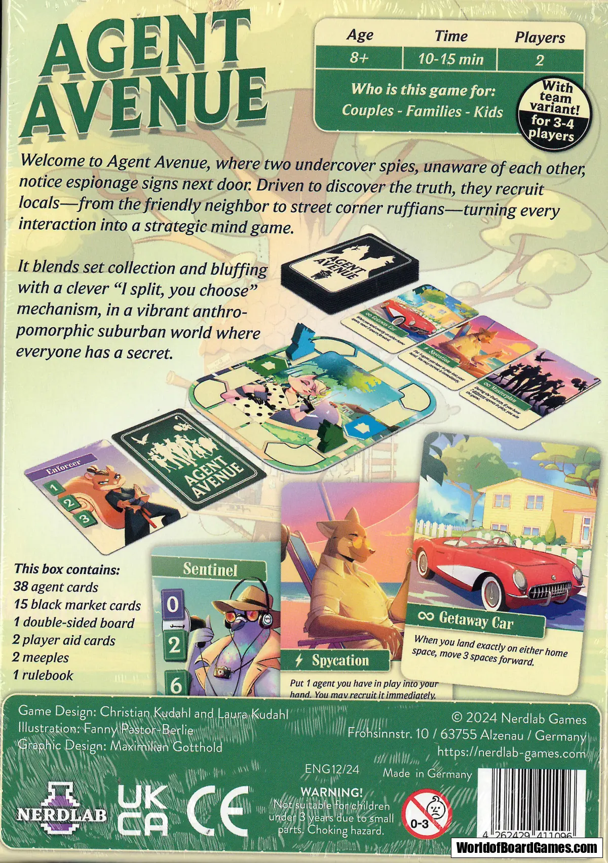 It blends set collection and bluffing with a clever "I split, you choose" mechanism, in a vibrant anthropomorphic suburban world where everyone has a secret.