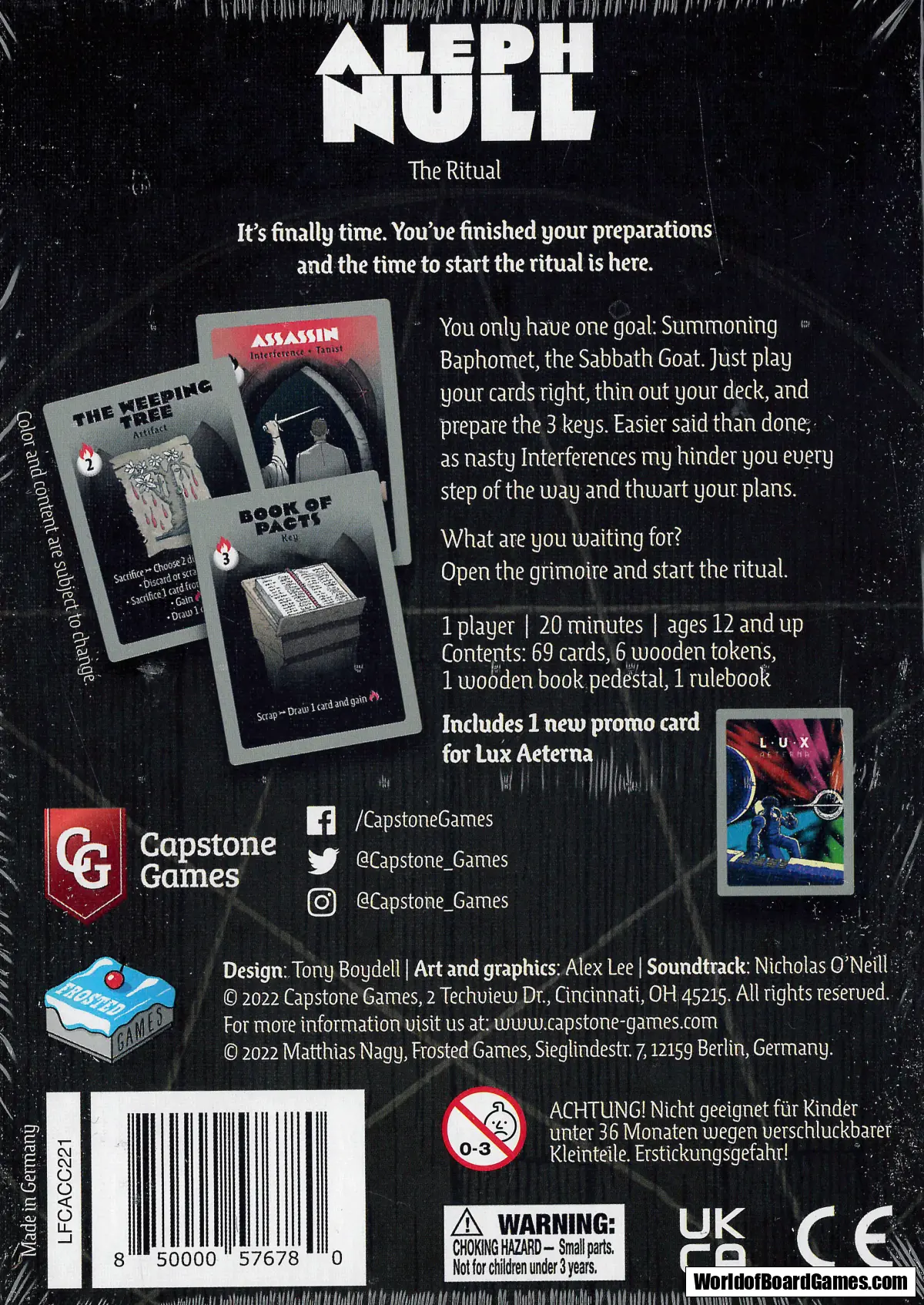 I Aleph Null är målet är att framgångsrikt kalla på den demoniska prinsen Baphomet som, när han dyker upp, förväntar sig att det inte finns några kort på din hand, i huvudstapeln och i avkastningshögen; om det finns några kort kvar i dessa "zoner" förlorar du. Men att "inte förlora" på detta sätt betyder inte att du har vunnit: alla kort som fortfarande är i spel räknas också mot dig - för många och du kommer också att förlora. Ju tidigare du "vinner", desto större är din chans att överleva ett eventuellt straff.
