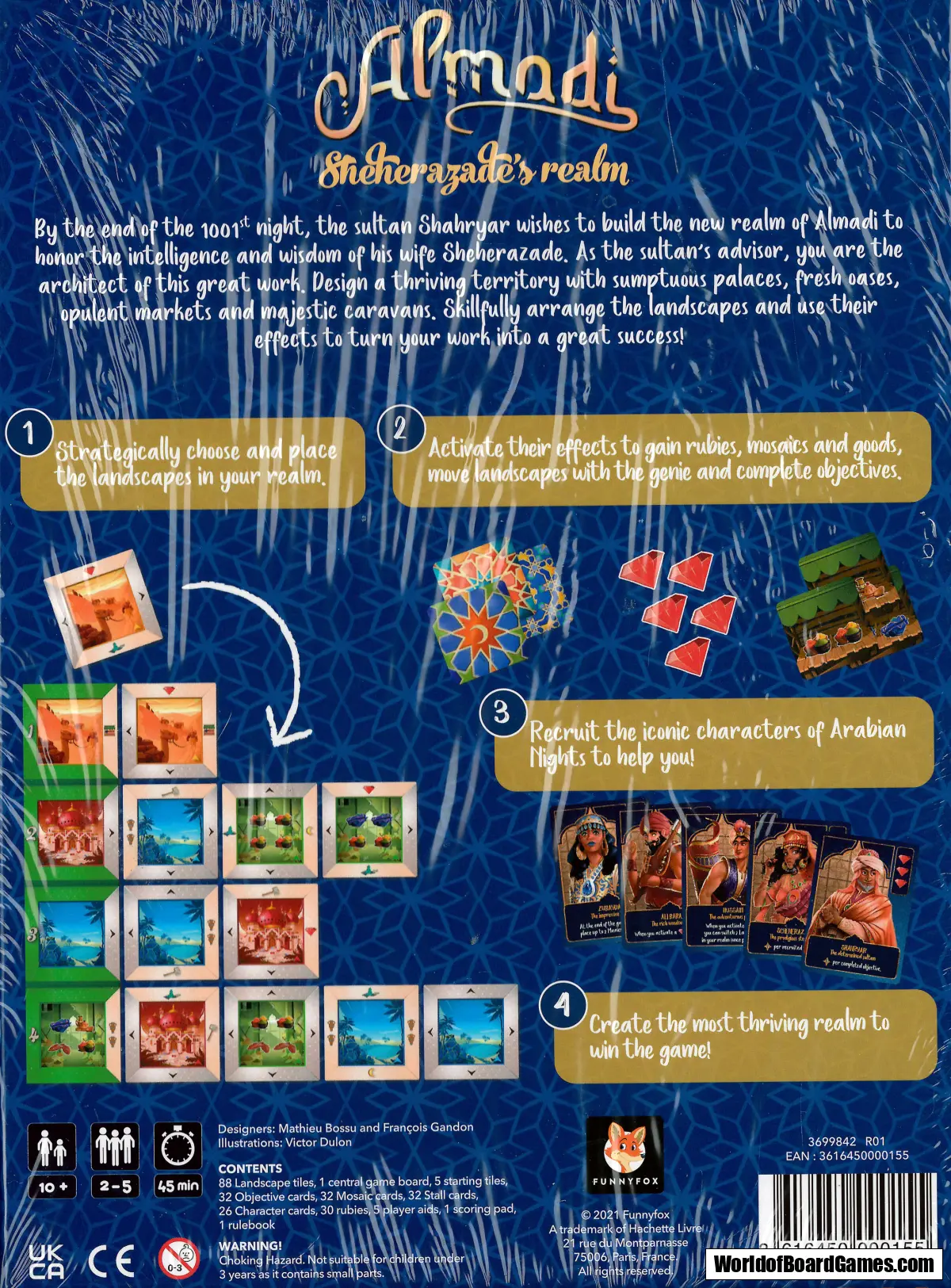 By the end of the 1001st night, the sultan Shahryar wishes to build the new realm of Almadi to honor the intelligence and wisdom of his wife Sheherazade. As the sultan’s advisor, you are the architect of this great work. Design a thriving territory with sumptuous palaces, fresh oases, opulent markets and majestic caravans. Skillfully arrange the landscapes and use their effects to turn your work into a great success!