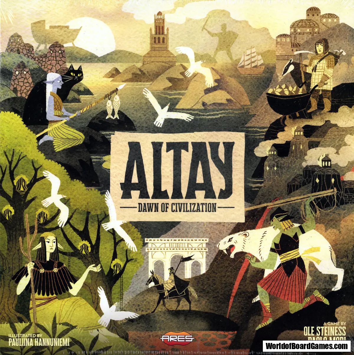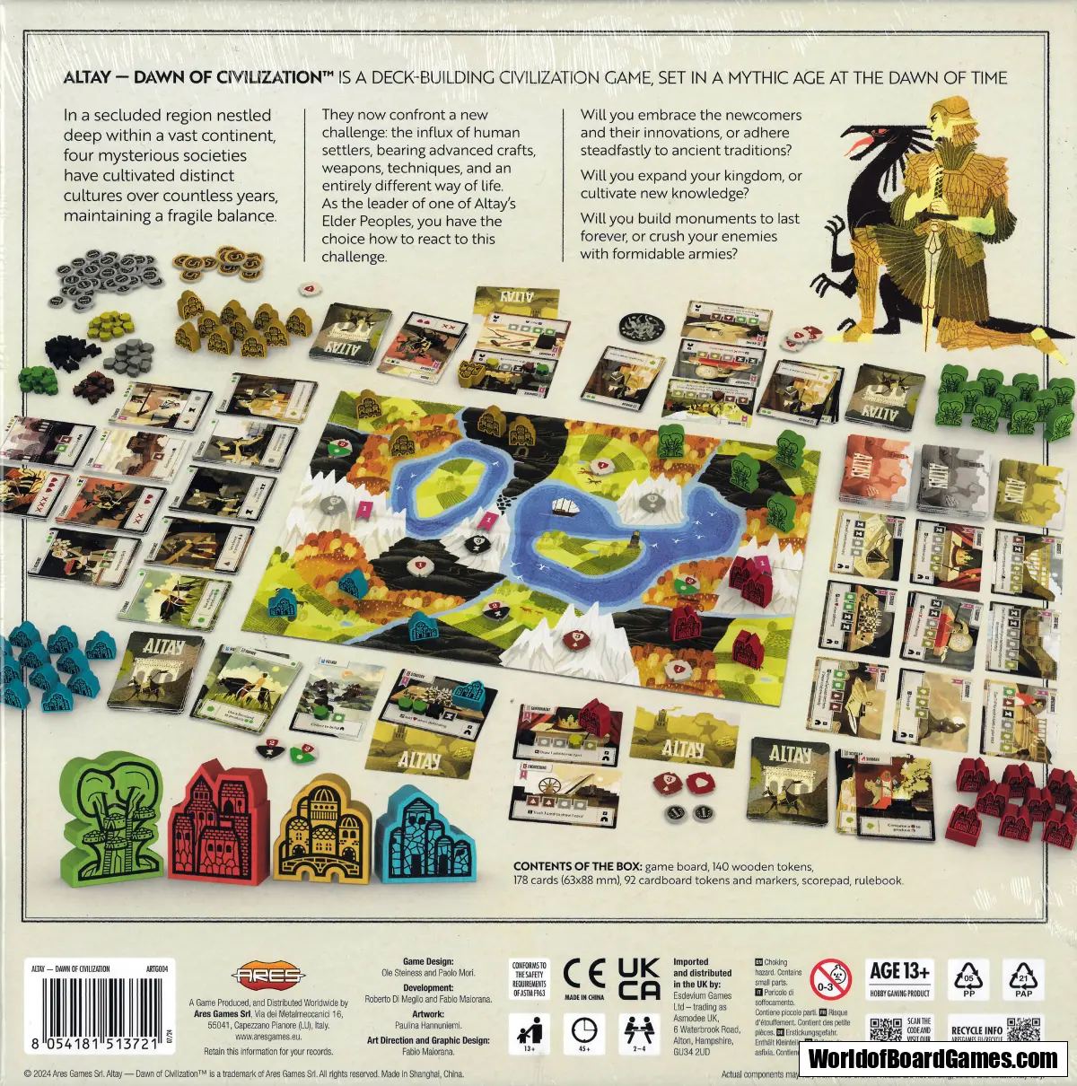 Altay: Dawn of Civilization is an original blend of deck-building, civilization development, and area expansion. Players control one of four factions, each represented by a starting deck with unique cards and with subtle differences in the number of "basic" cards. Each turn, players use their cards to produce resources (stone, metal, wood, knowledge), build new settlements and expand on the board, attack or defend against their enemies, or manipulate their decks or card hand.