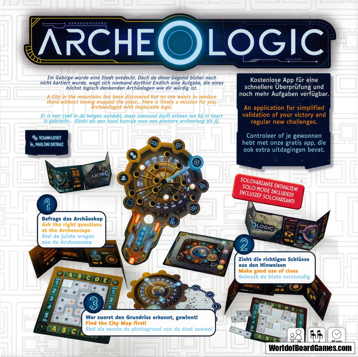 A city in the mountains was discovered, but no one dares to venture there without having mapped the place. Here is finally a mission for you, an archaeologist with implacable logic. ArcheOlogic is a competitive deduction game whose goal is to first find the exact location of the buildings of the city. To help you? An Archeoscope, the only research instrument capable of reading the coded cards left by the Ancients. Ask the Archeoscope your questions by adjusting its cogs, note the precious answers, and replace the buildings on your plan. Think carefully as some questions will take more time than others, but maybe their answer will help you win…