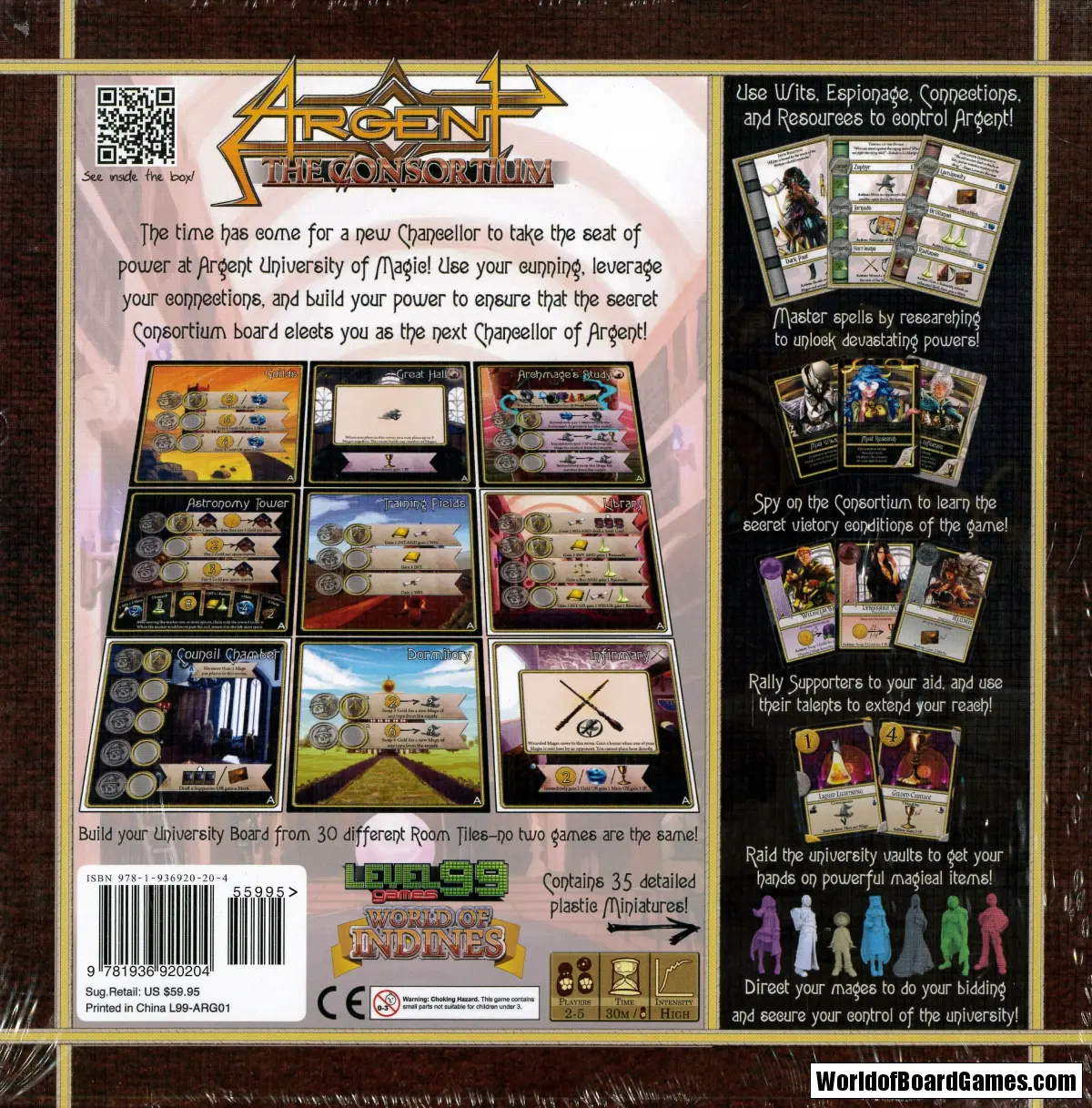 Argent: The Consortium is a cutthroat worker-placement/engine-building game of manipulation and secrecy in which the criteria for victory are secret and the capabilities of your opponents are constantly changing. You'll need to outwit the other candidates, use your spells at the right moment, and choose the correct apprentices to manage your plan.
