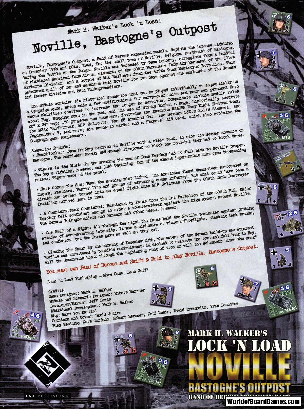 Designed by Lock 'n Load guru, Robert Herzner, Lock 'n Load: Noville -Bastogne's Outpost is an expansion to Band Of Heroes that depicts the intense fighting for the small town of Noville. Located northeast of Bastogne, Noville was defended by Team Desobry, straggers from a handful of shattered American formations, elements of the 506th Parachute Infantry Regiment of the 101st Airborne Division, and a handful of M-18 Hellcats from the 609th Tank Destroyer Battalion. This patchwork quilt of men and machines held Noville for two days against the onslaught of the German's 2nd Panzer Division and 26th Volkgrenediers.