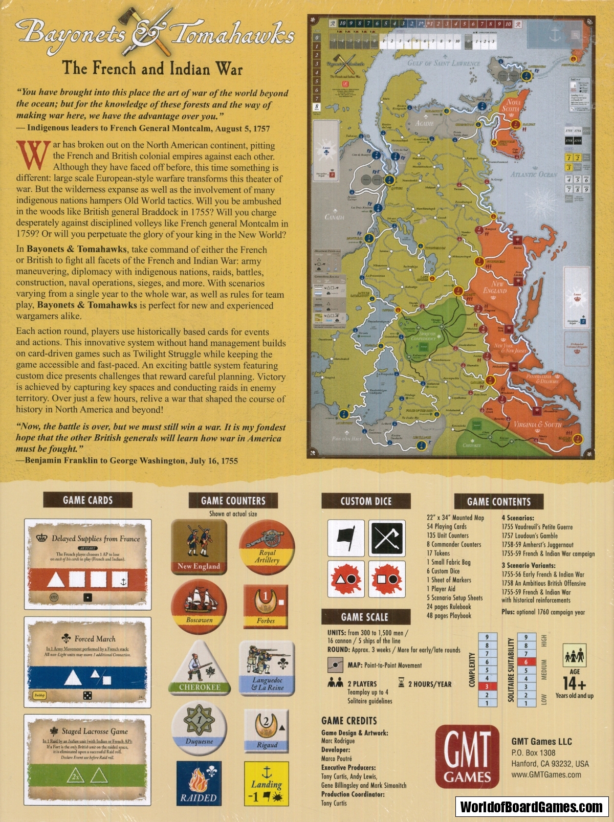 Bayonets & Tomahawks is a two-player grand strategic game depicting the French & Indian War, which raged from 1755 to 1760 and in which France's North American empire was conquered. Take command of either the French or British to fight all facets of the conflict: army maneuvering, diplomacy with indigenous nations, raids, battles, construction, naval operations, sieges, and more. With scenarios varying from a single year to the whole war, as well as rules for team play, Bayonets & Tomahawks is perfect for new and experienced wargamers alike.