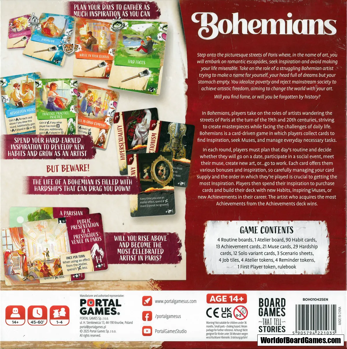 Bohemians is a card-driven game in which players collect cards to find inspiration, seek muses, and manage everyday necessary tasks.