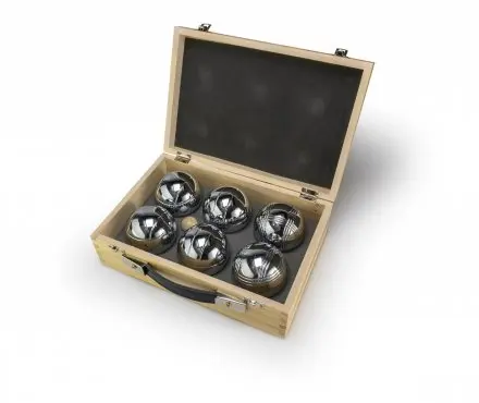 Bouleset i hög kvalitet och i en snygg trälåda med handtag, behändig att bära med sig.