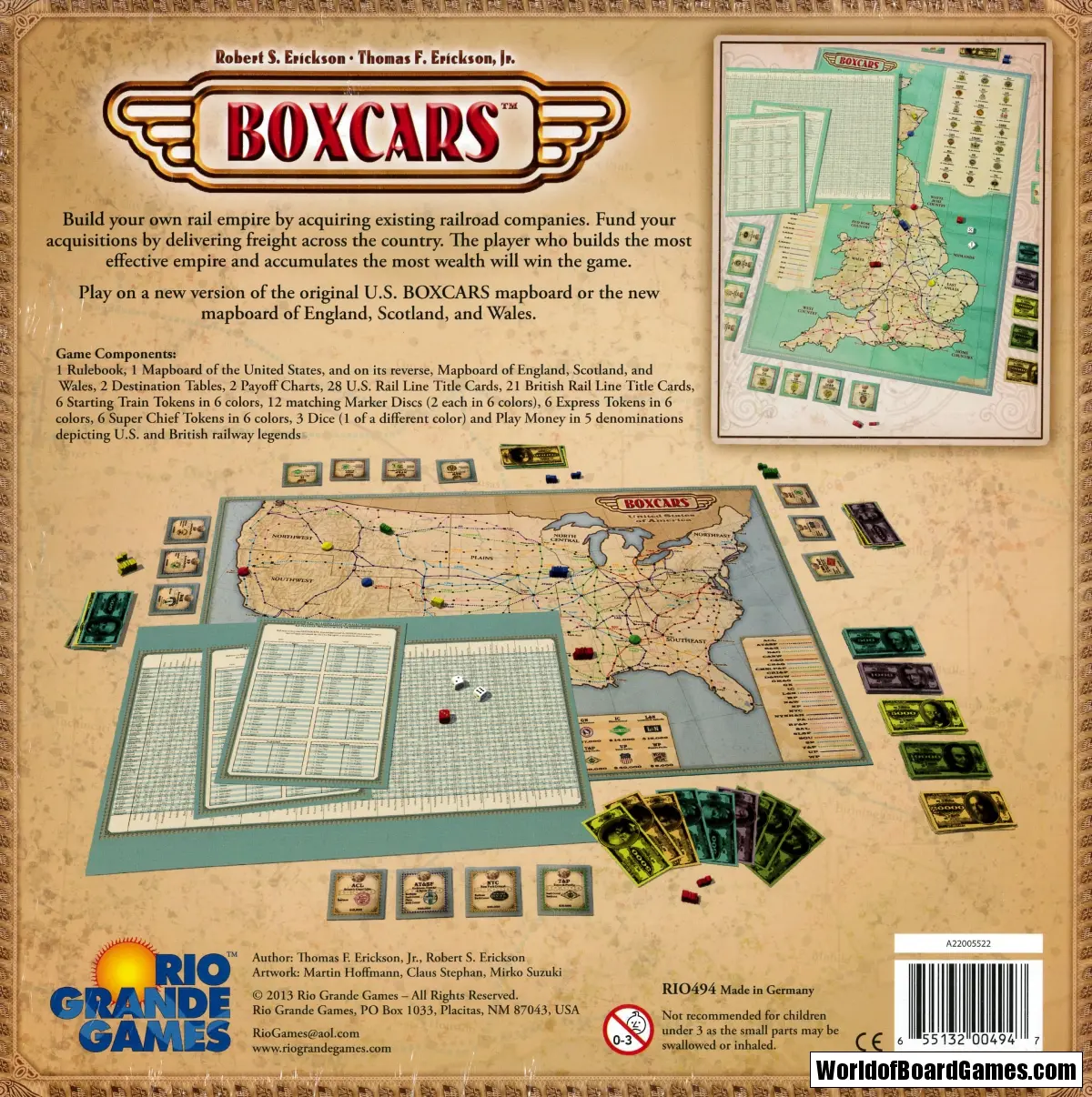 Build your own rail empire by acquiring existing railroad companies. Fund your acquisitions by delivering freight across the country. Th e player who builds the most eff ective empire and accumulates the most wealth will win the game. Play on a new version of the original U.S. BOXCARS mapboard or the new mapboard of England, Scotland, and Wales.