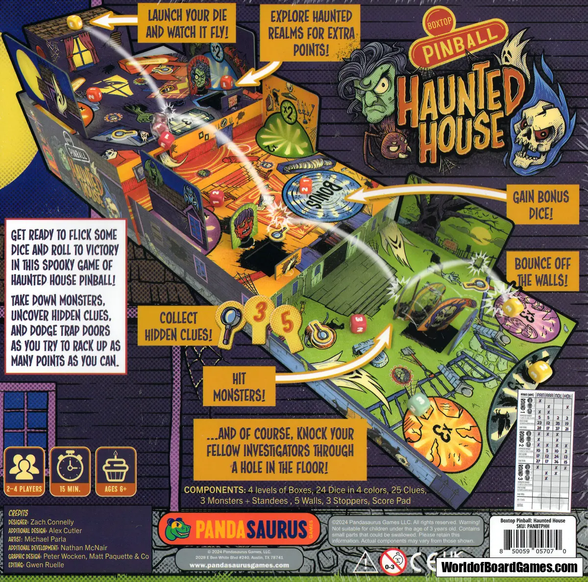 Varje omgång i Boxtop Pinball: Haunted House kastar du en av dina tärningar från startplattan in i kartongflipperspelet för att samla poäng. För varje tärning som finns kvar på maskinen i slutet av omgången får du det antal poäng som anges på tärningen, plus ytterligare poäng för olika bonusar. Tjäna poäng genom att slå monster, samla ledtrådar och stanna kvar i spökhusets rum. Om du landar i besvärjelsecirkeln får du en extra tärning!