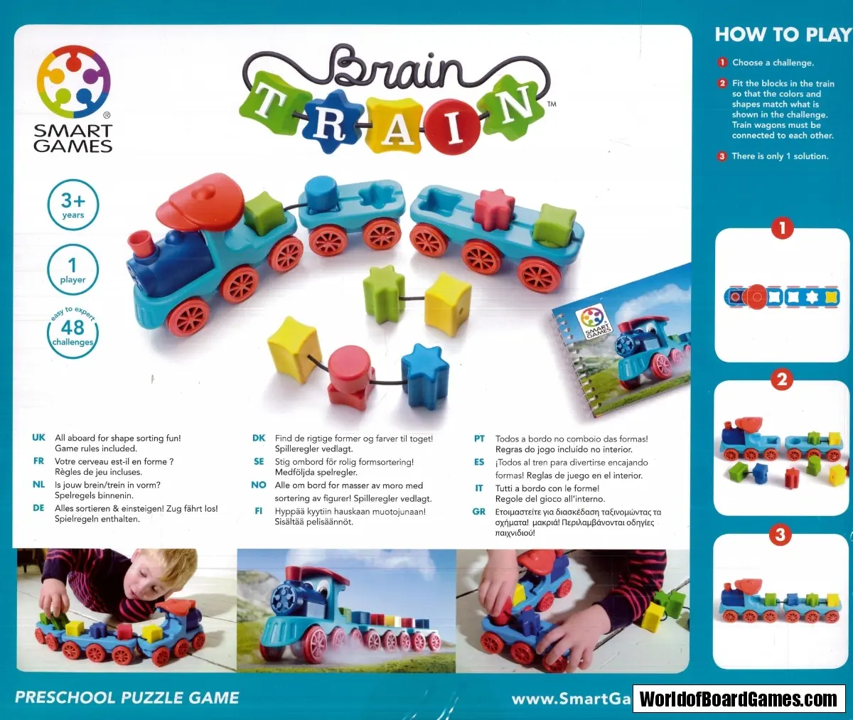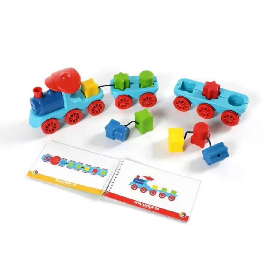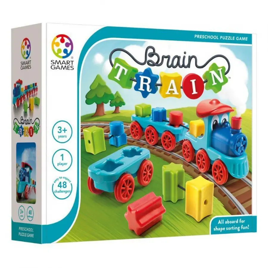 Train your brain with this colorful shape sorting game…that doubles as a toy! Can you match the shapes as shown in the challenge and place them in the right sequence? Each level offers fewer hints to complete your train. All aboard? Make sure that the wagons are connected to the steam engine before you depart!