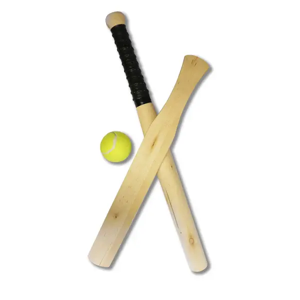 Brännbollsset i massivt trä. Innehåller 1 platt 50 cm och 1 rund 60 cm brännbollsträ med grepptejp, tennisboll + meshpåse att bära i.