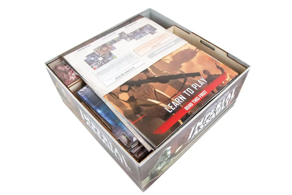 Put the Empire in its place with our Imperial Organizer compatible with Imperial Assault! Flexible and adaptable to your collection: our organizer features 9 trays to hold game pieces, boards, figures, 175 large sleeved cards, 360 small sleeved cards, with room left over for two AT-STs. Some dividers may be removed to allow space for even more figures.