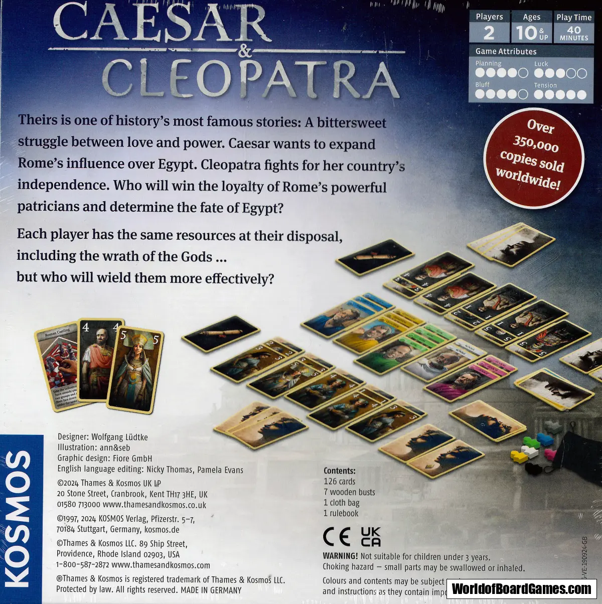 Caesar and Cleopatra är ett kortspel för två spelare där ni tar rollerna som dessa två historiska ledare. Caesar vill att Rom ska invadera Egypten, medan Cleopatra kämpar för självständighet – och båda försöker påverka de romerska ämbetsmännen till sin fördel.