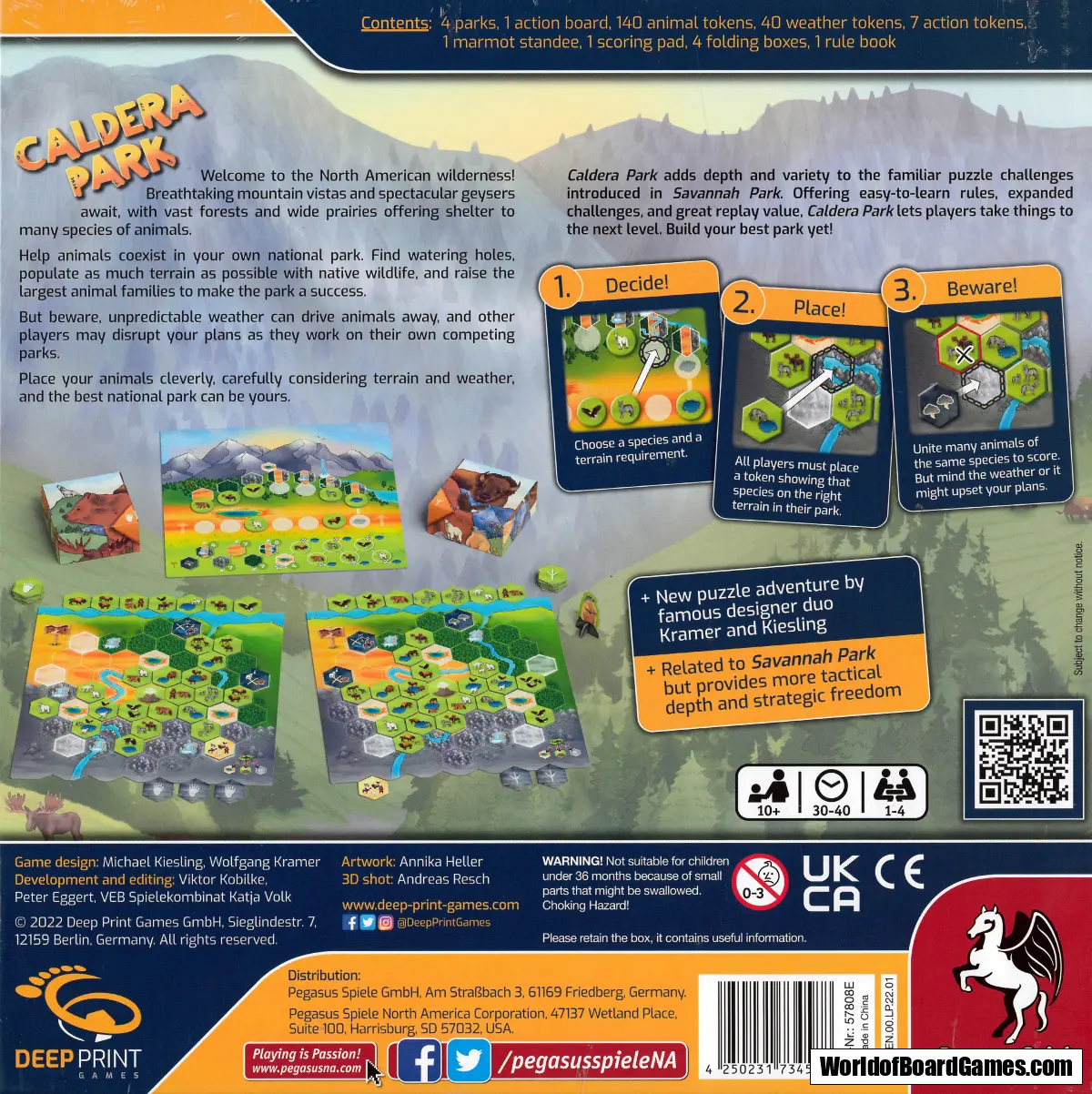 Welcome to the wilderness of North America! Breathtaking mountain views and spectacular geysers await you. Vast forests and prairie provide habitats for native animals. Your task is to group animals of the same species together in families as large as possible. But large families are only half the battle: to score a lot of points, they also need access to watering holes and must avoid bad weather.