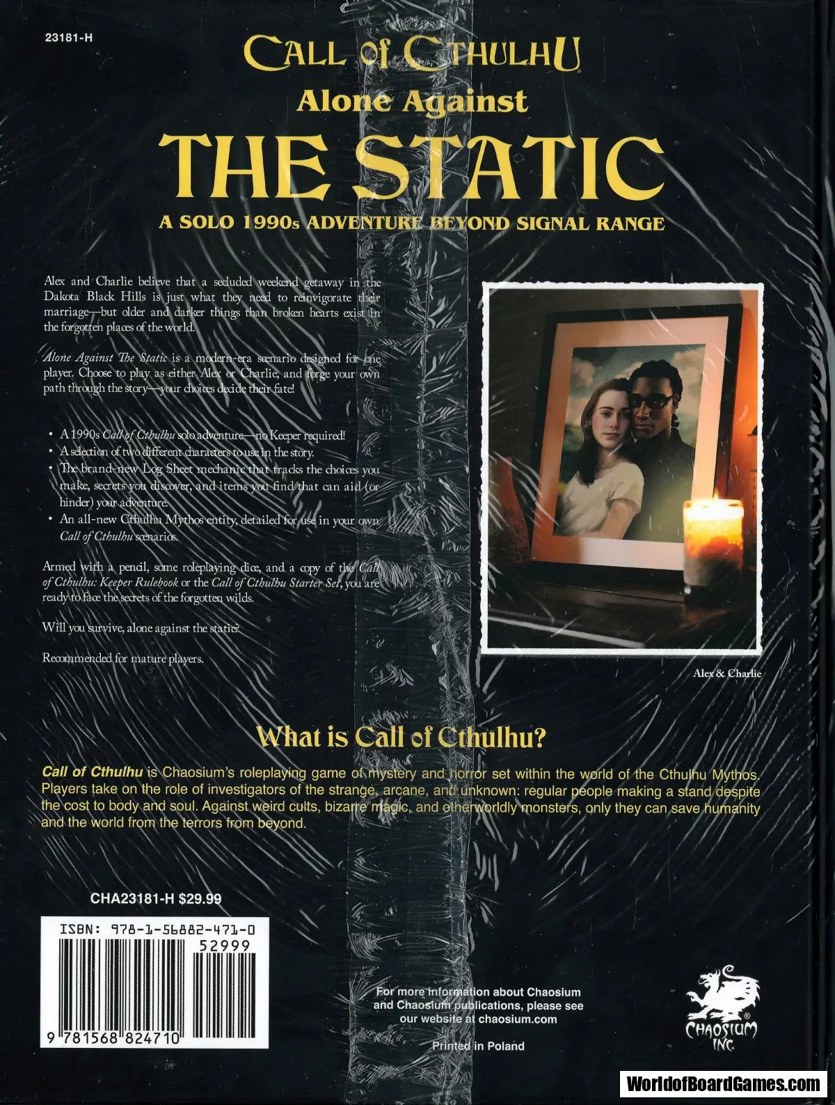 Alone Against The Static is an award-winning solo adventure for Call of Cthulhu, set in the eerie Black Hills of South Dakota in the 1990s. Play as Alex or Charlie as your secluded weekend getaway spirals into a supernatural nightmare. With branching paths, innovative solo mechanics, and a brand-new Mythos entity, this gripping narrative experience is as chilling as it is unforgettable.