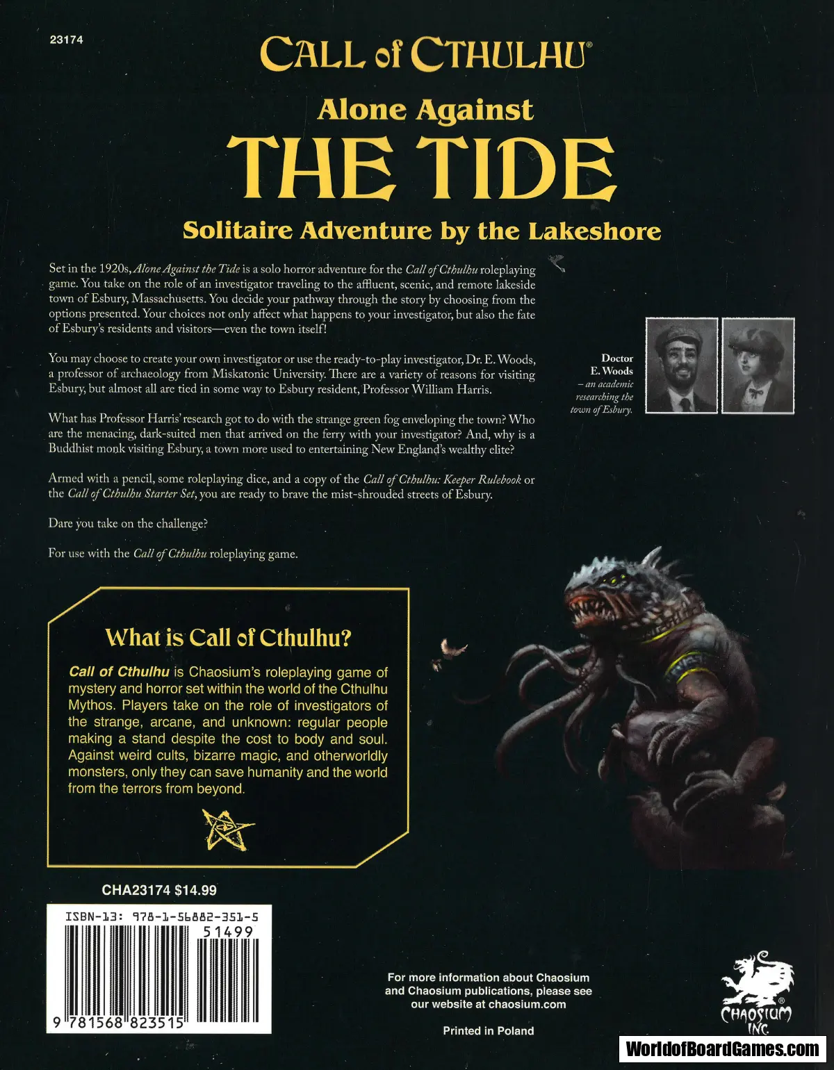 Alone Against the Tide is a solo horror mystery for Call of Cthulhu, set in the misty lakeside town of Esbury. As a lone investigator, uncover the truth behind Professor Harris’ research, a strange green fog, and mysterious visitors. With multiple endings, a flexible character system, and a narrative designed for solo or shared play, this story-driven experience offers thrilling replayability and eerie atmosphere.