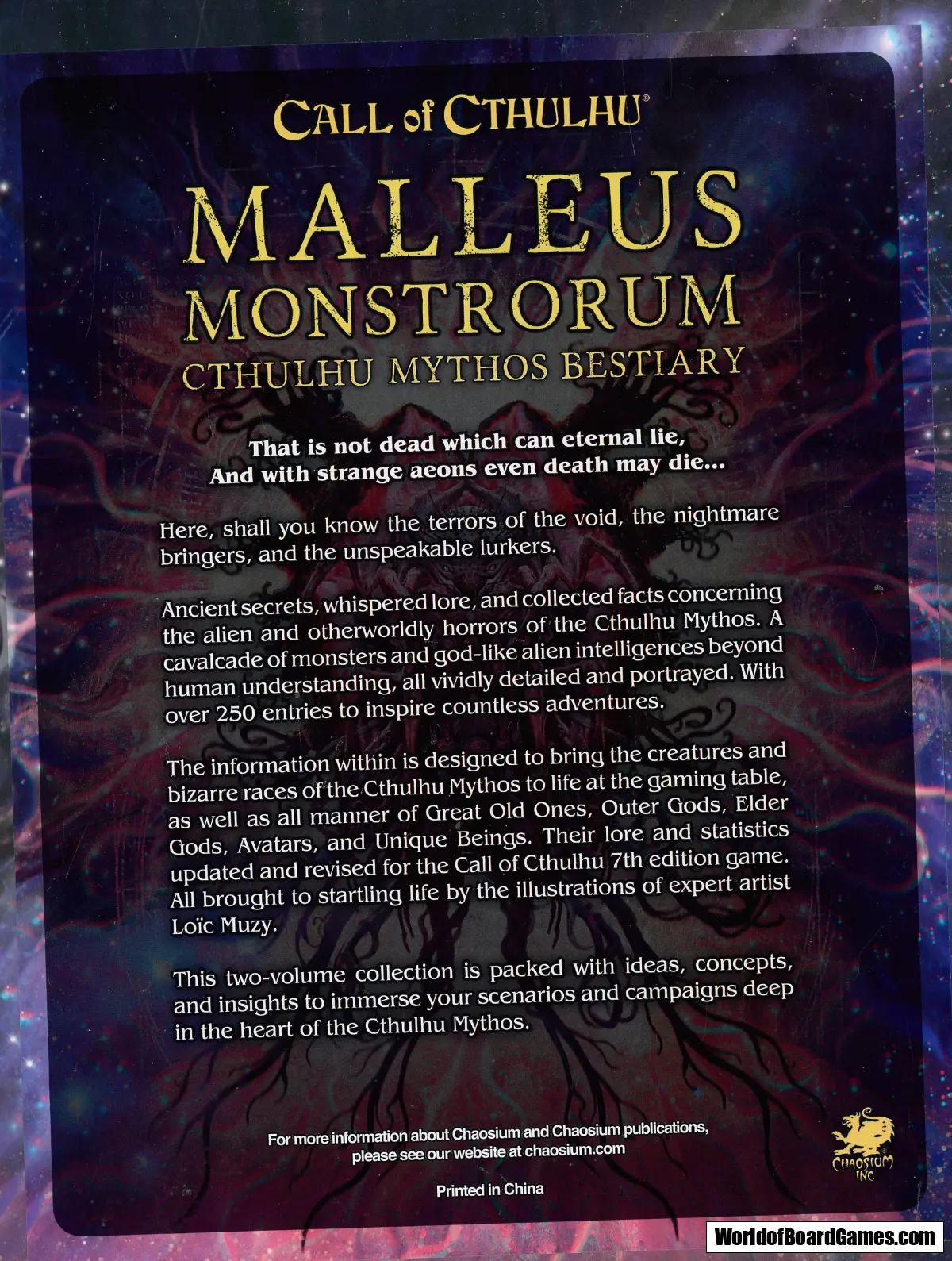 Malleus Monstrorum Slipcase Set är det ultimata bestiariet för Call of Cthulhu 7th Edition, med över 250 monster, gudar och mytologiska väsen i två stora böcker. Från folklorens fasor till de obeskrivliga Great Old Ones, denna överdådiga uppsättning driver skrämmande äventyr med ett välutvecklat universum och fantastiska konstverk. Ett oumbärligt samlarobjekt för Keepers och fans av kosmisk skräck.
