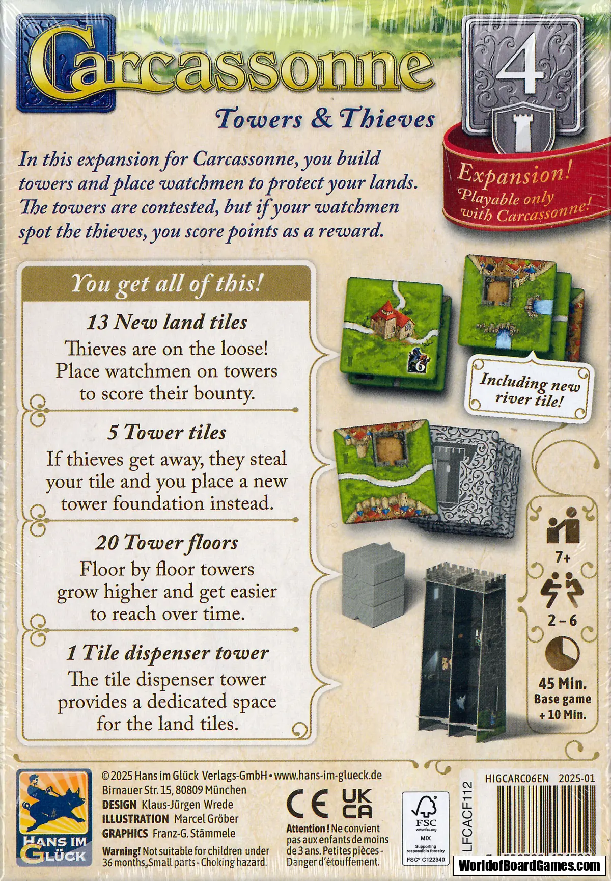 I Carcassonnes tredje expansion bygger du torn och sätter ut vakter för att skydda omgivningarna mot stöld. Tornen kan bestridas, men om dina vakter upptäcker tjuvarna så får du poäng som belöning!