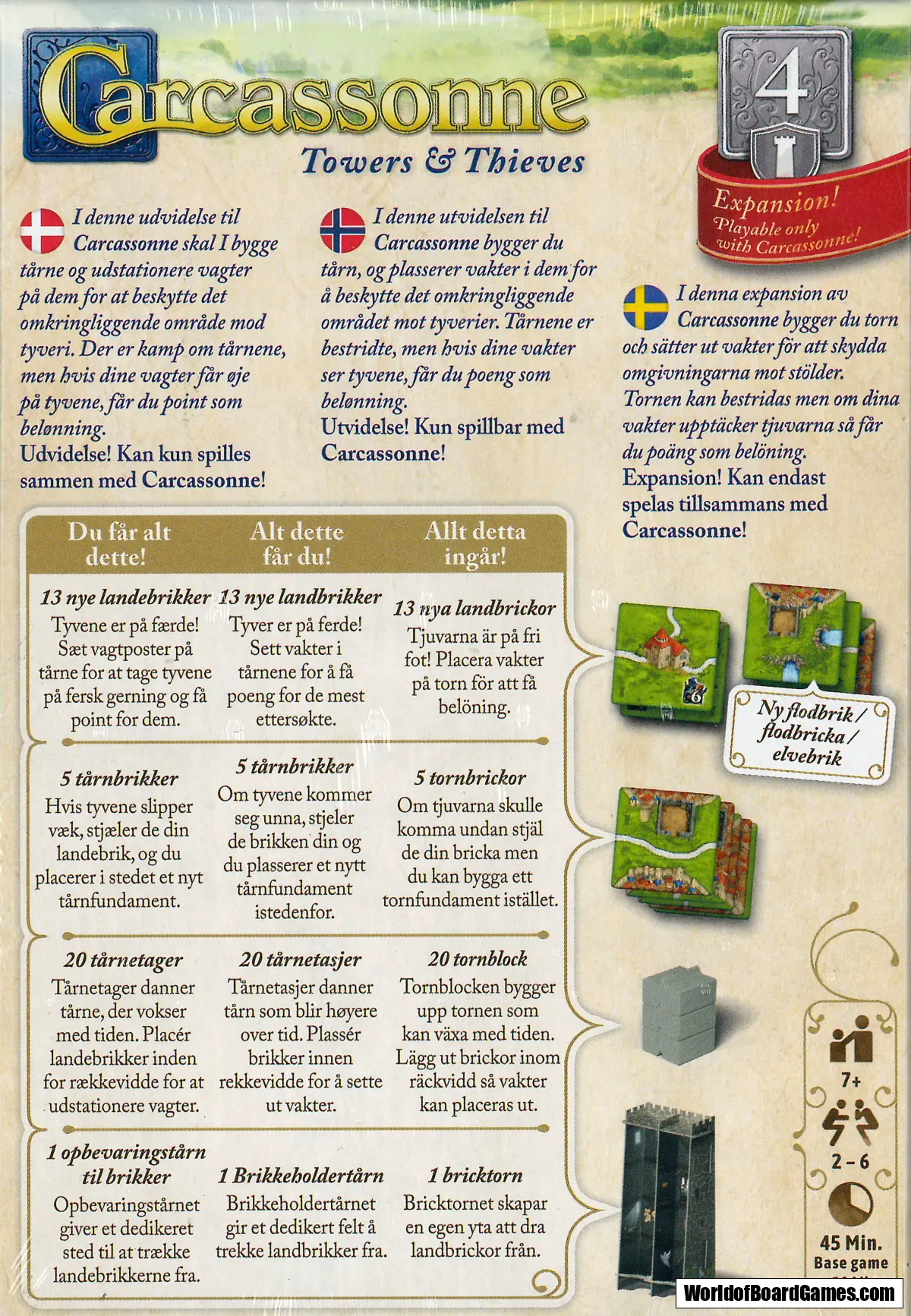I Carcassonnes tredje expansion bygger du torn och sätter ut vakter för att skydda omgivningarna mot stöld. Tornen kan bestridas, men om dina vakter upptäcker tjuvarna så får du poäng som belöning!