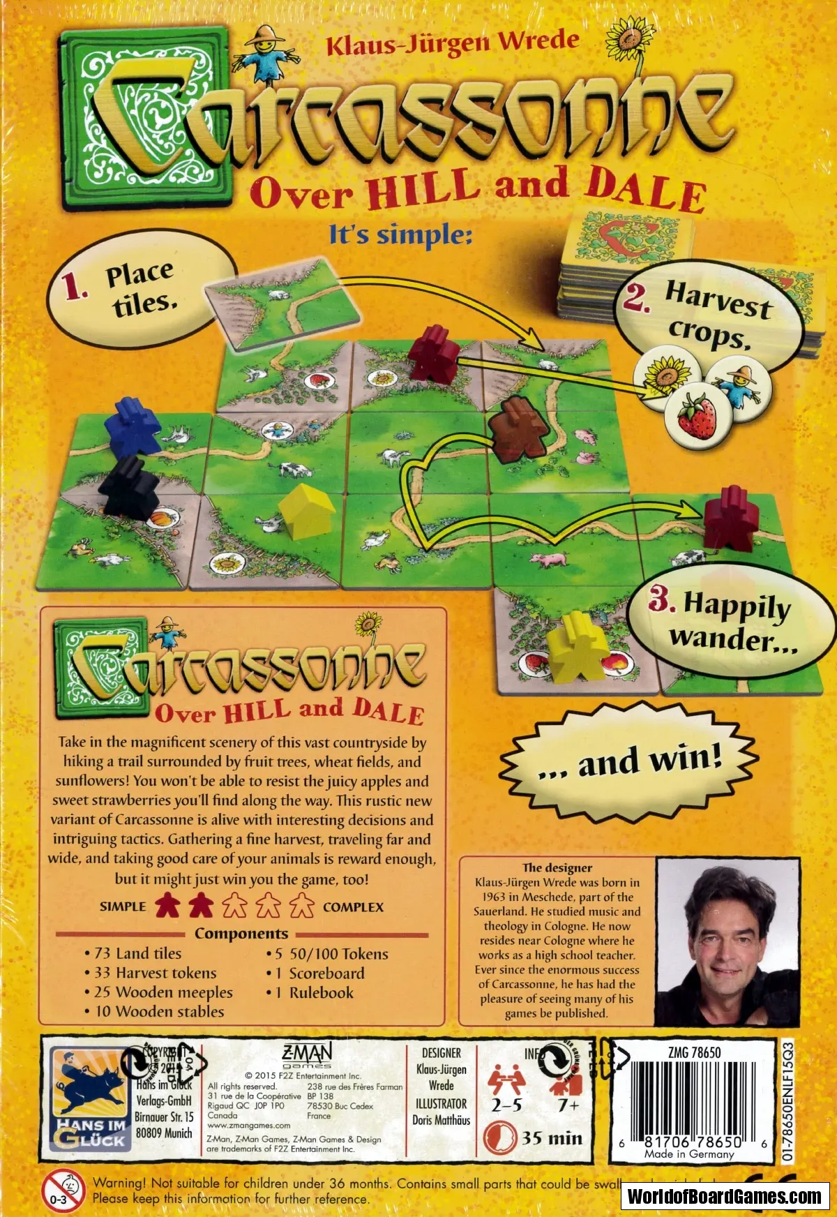 Skörda åkrar, vandra längsmed vägar och samla djur i stallen! Denna variant på det klassiska Carcassonne (SVE) använder samma välkända spelmekanik för att bygga upp spelplanen - som man sedan placerar ut sina ”meeples” på - men med flera nya sätt att plocka poäng på! Färdiga åkrar skördas och utplacerade spelfigurer kan vandra längsmed vägarna, medan stall placeras ut på ängarna för att samla alla djur runtomkring.
