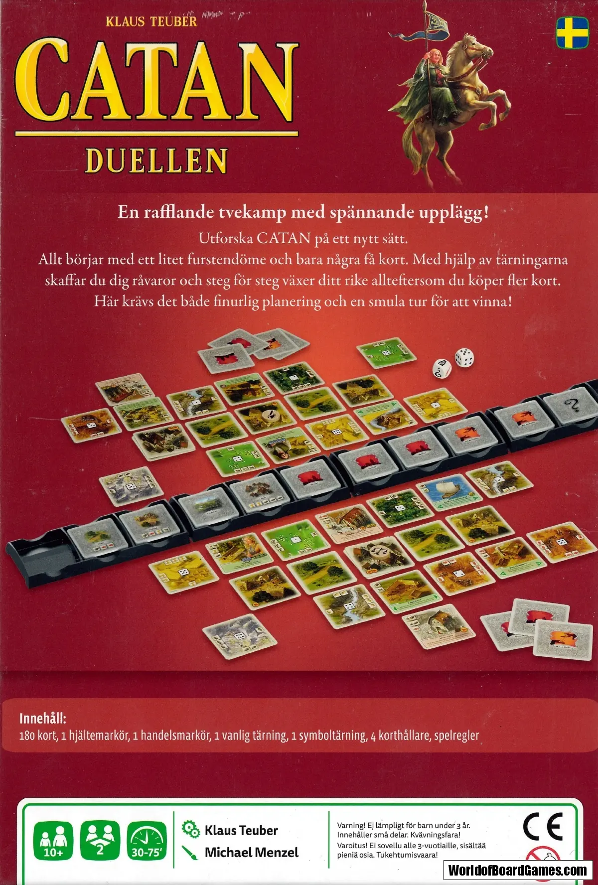 Catan Duellen är ett strategiskt kortspel för 2. Allt från det klassiska spelet är utbytt mot något så enkelt som en kortrad. Resultatet är ett spel som fortfarande är lika strategiskt som sin stora föregångare men som lättare kan spelas på bordet, oavsett vart du befinner dig.