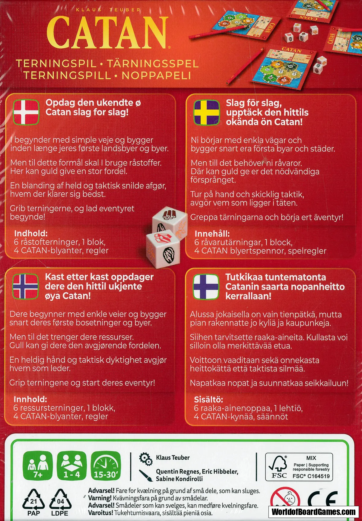 I denna reseversion av det klassiska Catan‑universum bygger varje spelare sin egen lilla värld – helt utan spelbräde. I stället fyller man i sitt eget block med vägar, städer och bosättningar, utifrån de resurser man slår fram med sex specialtärningar.
