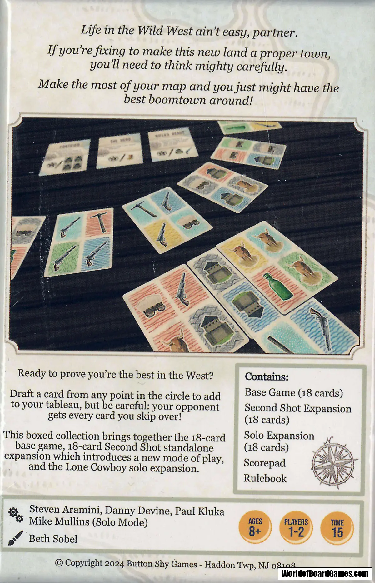 Blaze a trail by draftin’ cards ’round the circle and placin’ ’em in yer town, tryin’ to connect matchin’ territories to score prosperity points! But don’t forget about them three bonus cards in the center of the circle that can score ya even more points — that is, if ya play yer cards right. With over 800 unique ways to score and millions of draftin’ and placin’ combos, you’ll never build the same town twice!