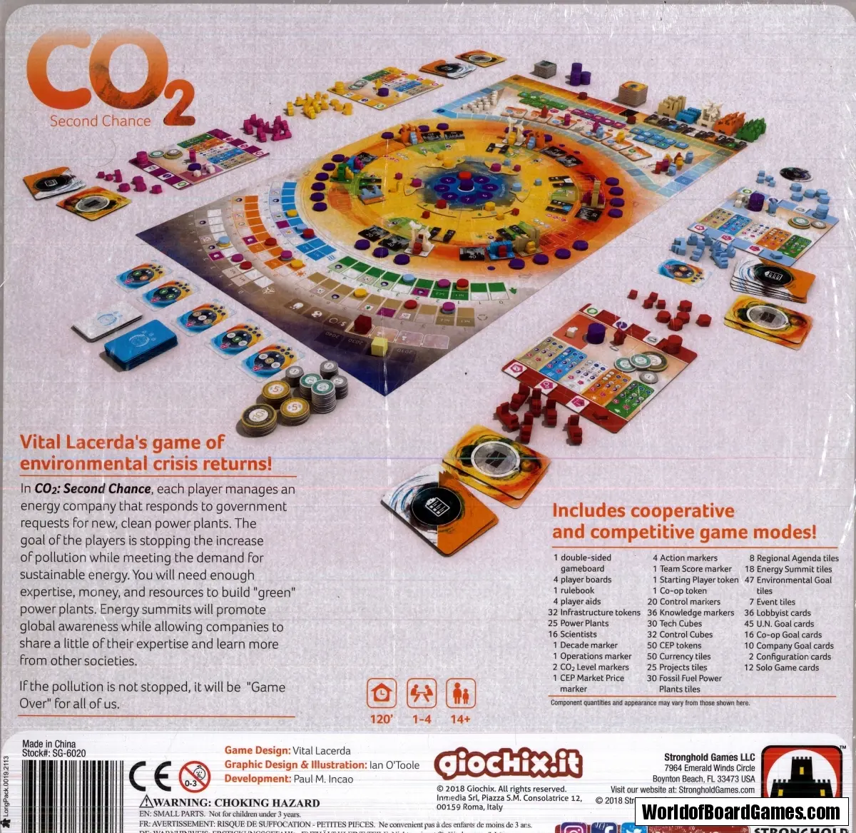 In CO₂: Second Chance, each player is CEO of an energy company responding to government requests for new, green power plants. The goal is to stop the increase of pollution while meeting demand for sustainable energy. You need expertise, money, and resources to build these clean power plants, and Energy Summits to promote global awareness. If the pollution isn’t stopped, it’s game over for all of us!