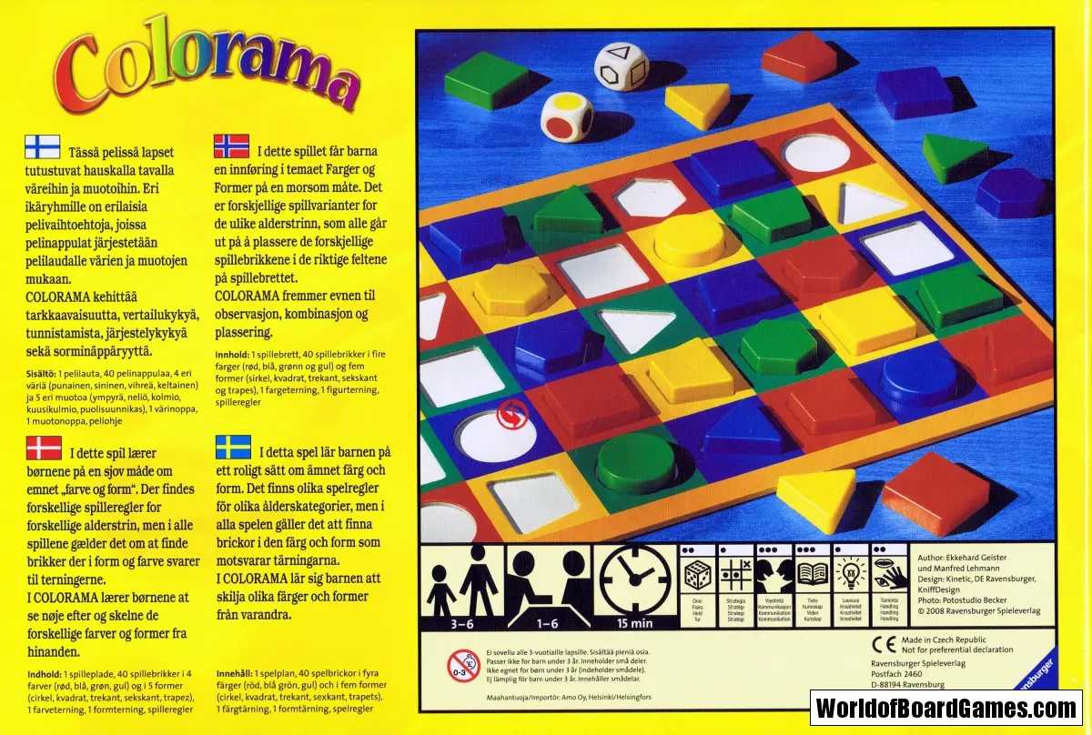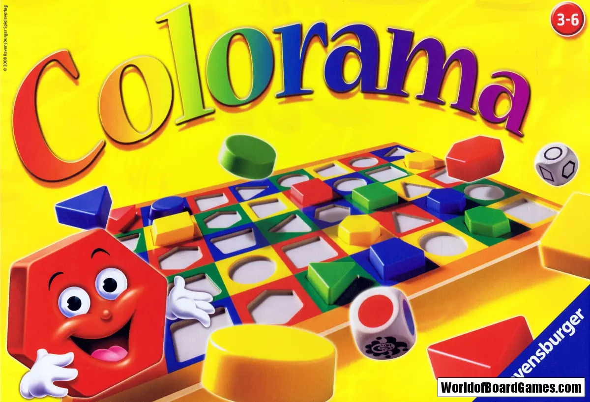 Ett färgglatt tärningsspel med olika spelvarianter där det gäller att finna brickor i den färg och form som motsvarar tärningarna. Spelplanen har utstansade fält, vilket gör att brickorna ligger stadigt på planen.