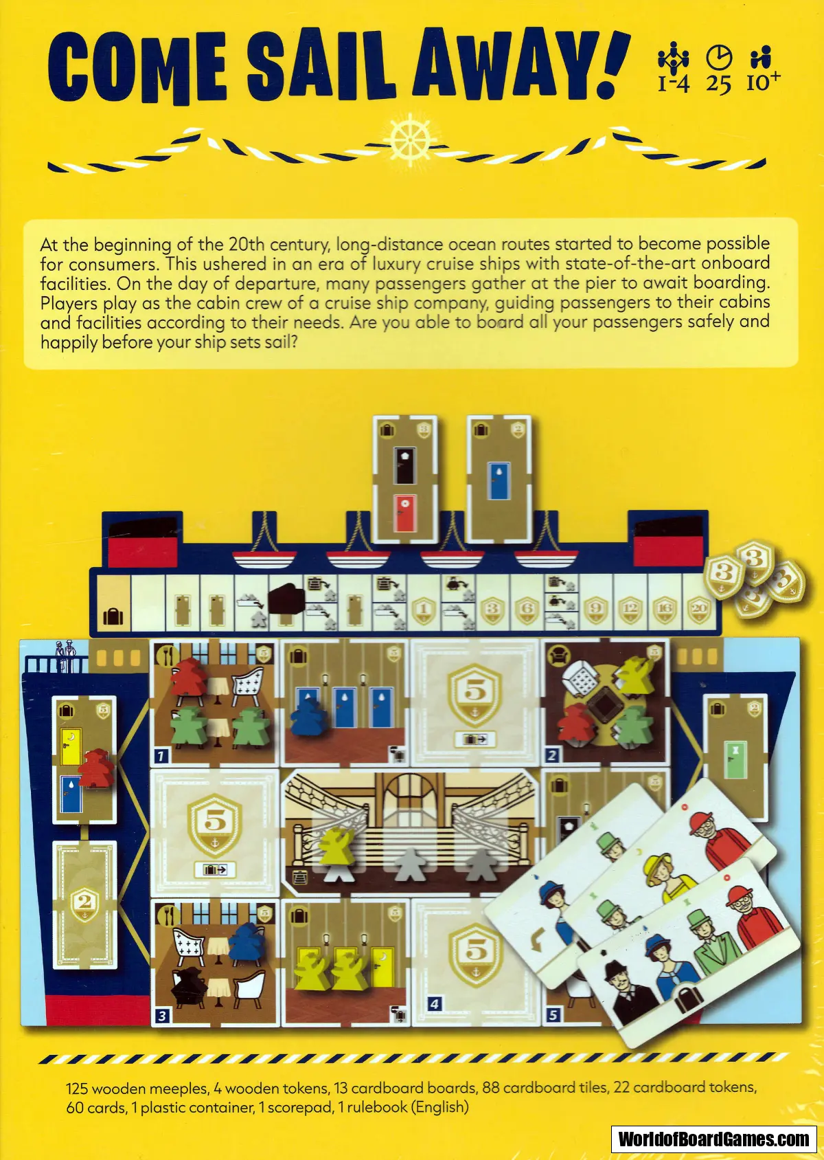 Come Sail Away! is a board game for 1 to 4 players in which you will compete to board passengers upon your luxury liner, bringing them to their favourite cabins and facilities. Players can enjoy a deliciously thoughtful and brightly illustrated game that is simple to learn yet always challenging.