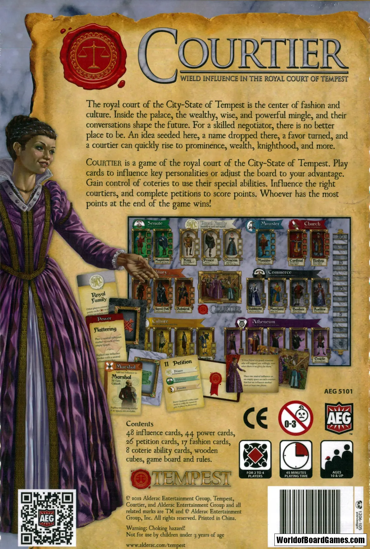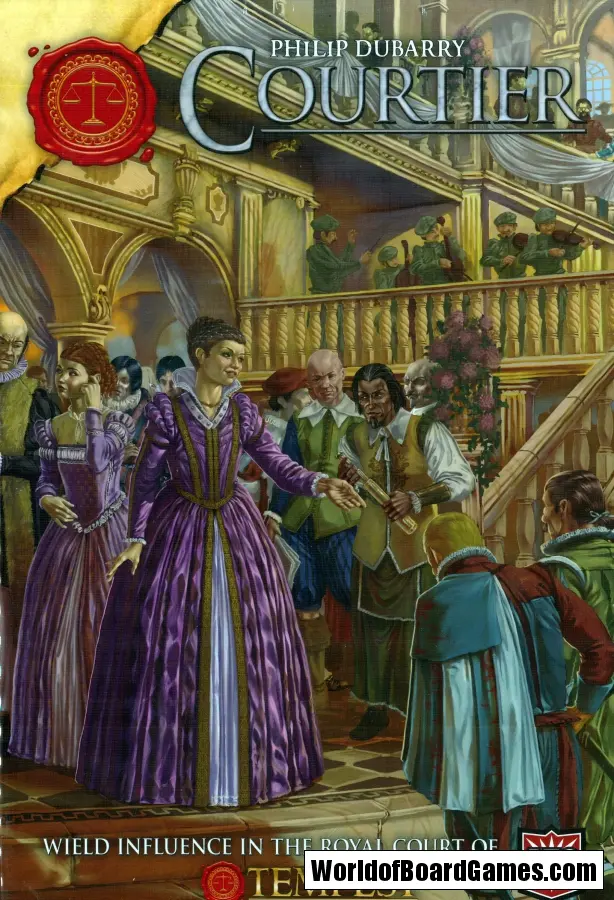 In Courtier, 2–4 players compete for recognition in the royal court. Your mission is to act as an influence broker, manipulating the levers of power and granting favors to important supplicants. You accomplish this by influencing key people to act at your behest.
