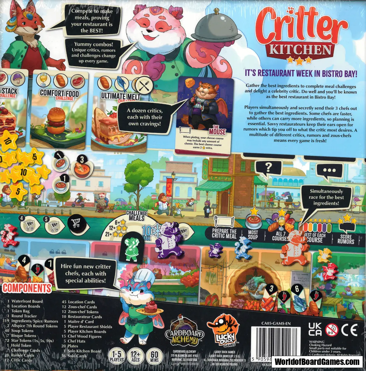 Challenges, revealed in rounds 1 through 6, offer the players opportunities to earn stars for crafting dishes with specific ingredient requirements. After round 7 the players must create an epic meal to impress the celebrity critic and cater to their appetites. A multitude of different critics, rumors and restaurateurs mean every game is fresh!