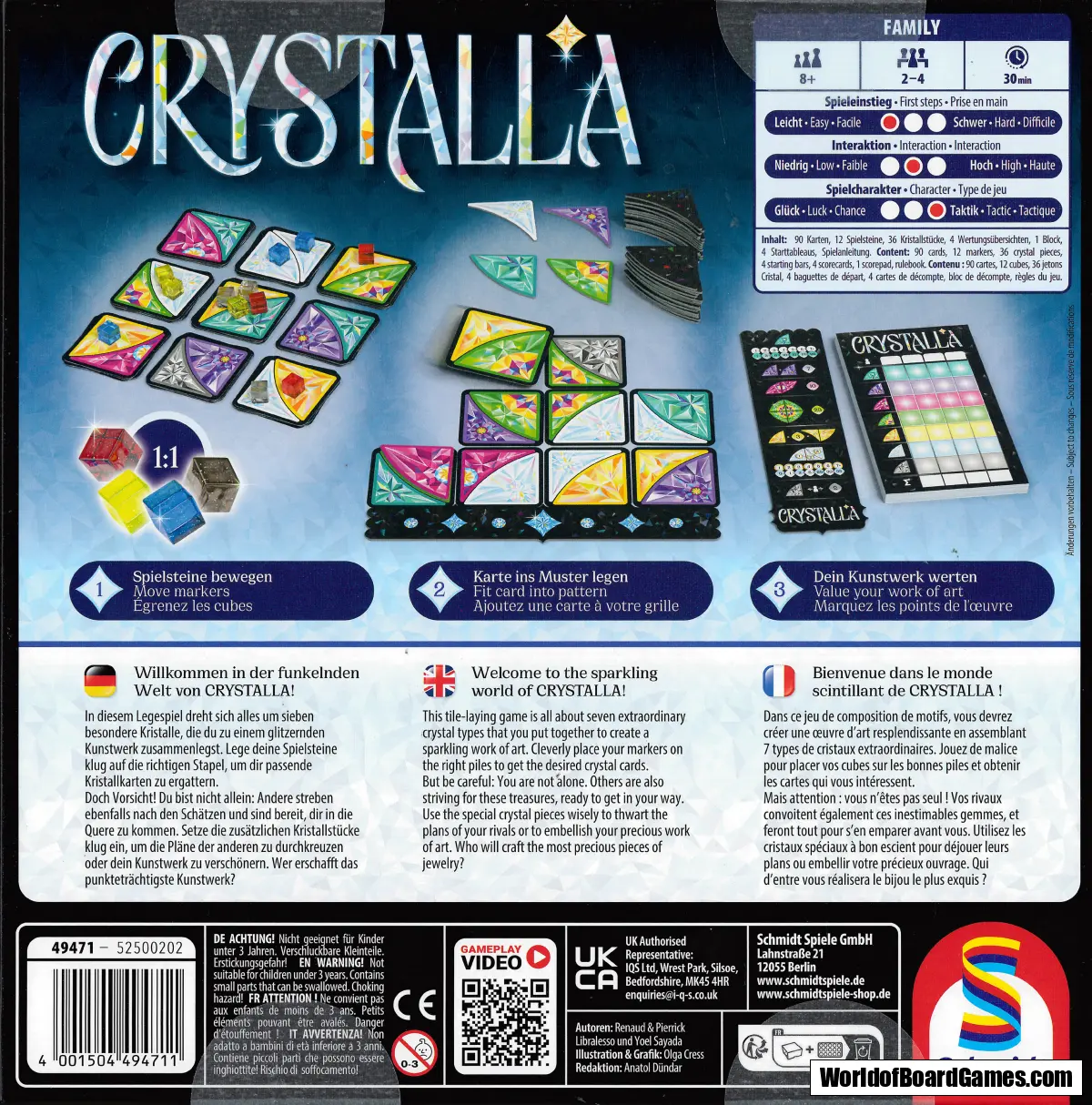 Cleverly place your game pieces in the correct piles to acquire matching crystal cards. But be careful! You're not alone: Others are also striving for the treasures and are ready to get in your way. Use the extra crystal pieces wisely to thwart others' plans or enhance your work of art. Who will create the highest-scoring work of art?