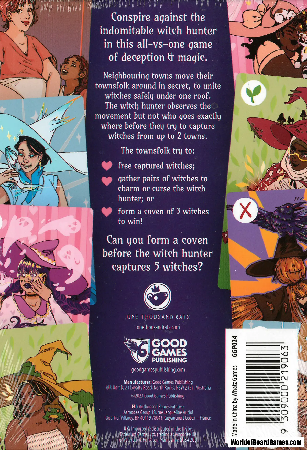 Curses & Covens is an all vs one game where one player takes on the role as the witch hunter, while all other players are towns trying to protect the friendly witches! The aim of the witch hunter is to capture 5 witches, while the towns want to form a coven of three witches of the same suit in one player’s hand to win.