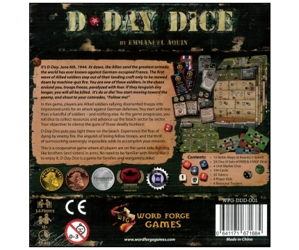 The 2nd Edition of D-Day Dice, published by Word Forge Games, sees new art, new maps, and revised cards and rules. It is fully compatible with the previous version, but adds new mechanics and play concepts to the highly successful D-Day Dice franchise. Normandy, June 6th, 1944: As you land on the well-defended beaches, a German machine gun nest is killing your comrades like flies. You must do something! In D-Day Dice, players are Allied soldiers trying to organize improvised units for an attack against the machine gun nest. Each player starts the game with a unit of a few soldiers and nothing else. As the game progresses, he will collect resources and advance on the beach, sector by sector, as his unit grows stronger and deadlier. He will succeed...or die trying. D-Day Dice is a multiplayer co-op game, where all players play their turn simultaneously and must help each other in order to stay alive. It also includes solitaire optional rules. Although built around dice rolling, this game is about resource management (soldiers, specialists, items and courage) and knowing when to move your unit. Resources are kept from turn to turn, so the players can plan ahead.