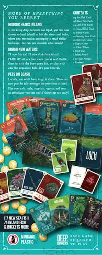 Gameplay in Even Deeper Regrets is the same as in the base game with one major exception: you can now choose to start each day Inland in addition to Sea and Port! Inland, you can fish from three River shoals or one Loch shoal, both of which have a higher risk/reward ratio than the Sea. 74 new fish and 25 dinks await inland!