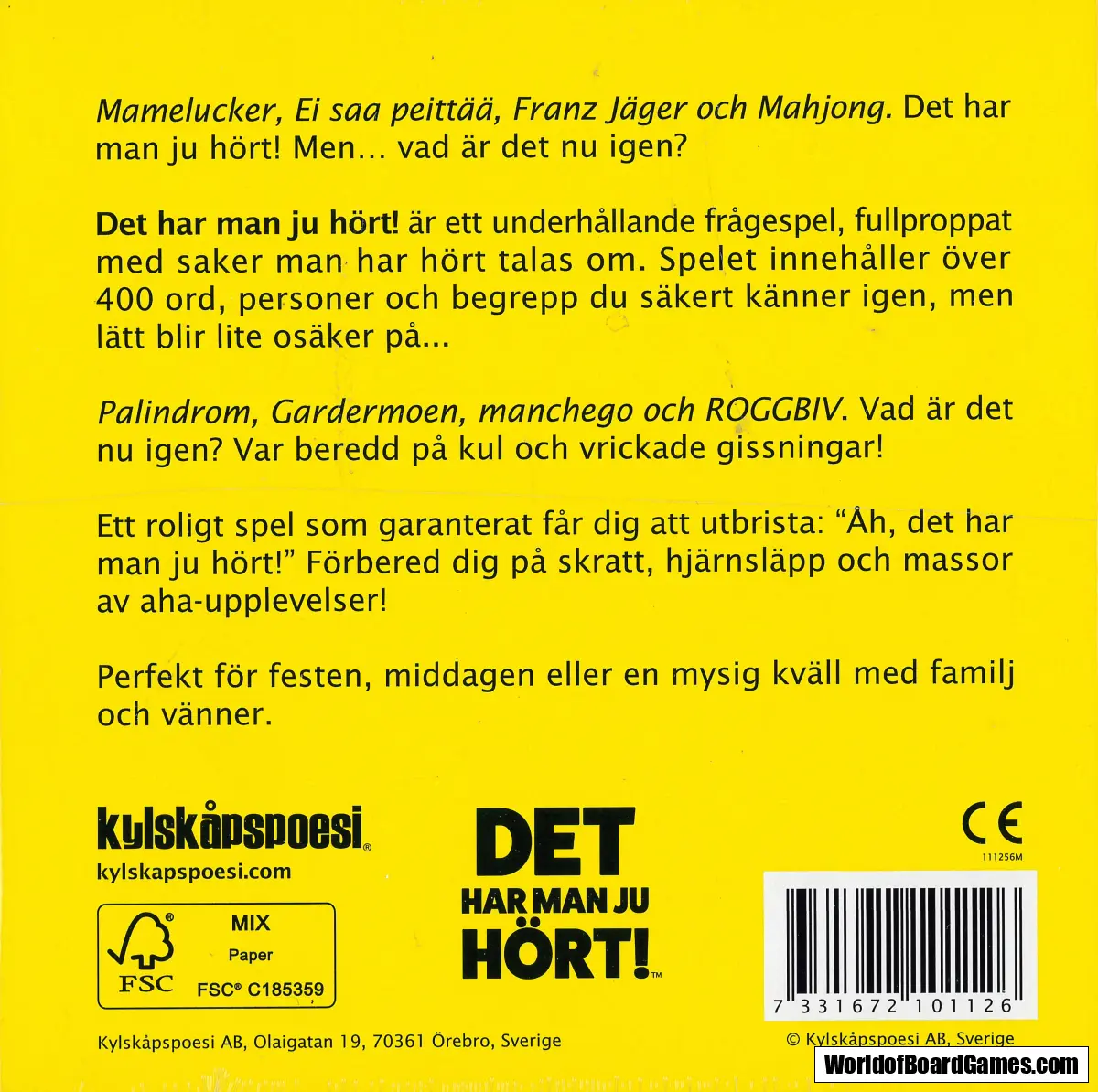 Det har man ju hört! är ett underhållande frågespel, fullproppat med saker man har hört talas om. Spelet innehaller över 400 ord, personer och begrepp du säkert känner igen, men lätt blir lite osäker på...