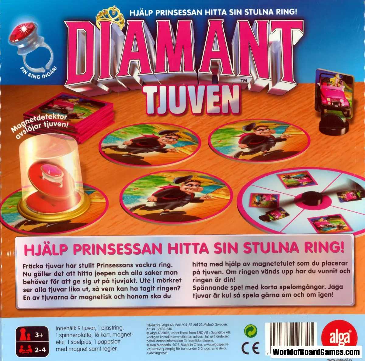 Fräcka tjuvar har stulit prinsessans ring. Men ute i mörkret ser alla bovar likadana ut, så vem kan ha tagit den? En magnetdetektor avslöjar vem som har stulit prinsessans dyrbaraste ägodel. Spelet innehåller både en fin prinsessring och en smart magnetdetektor. Det går undan när det är roligt, det är bara att spela igen!