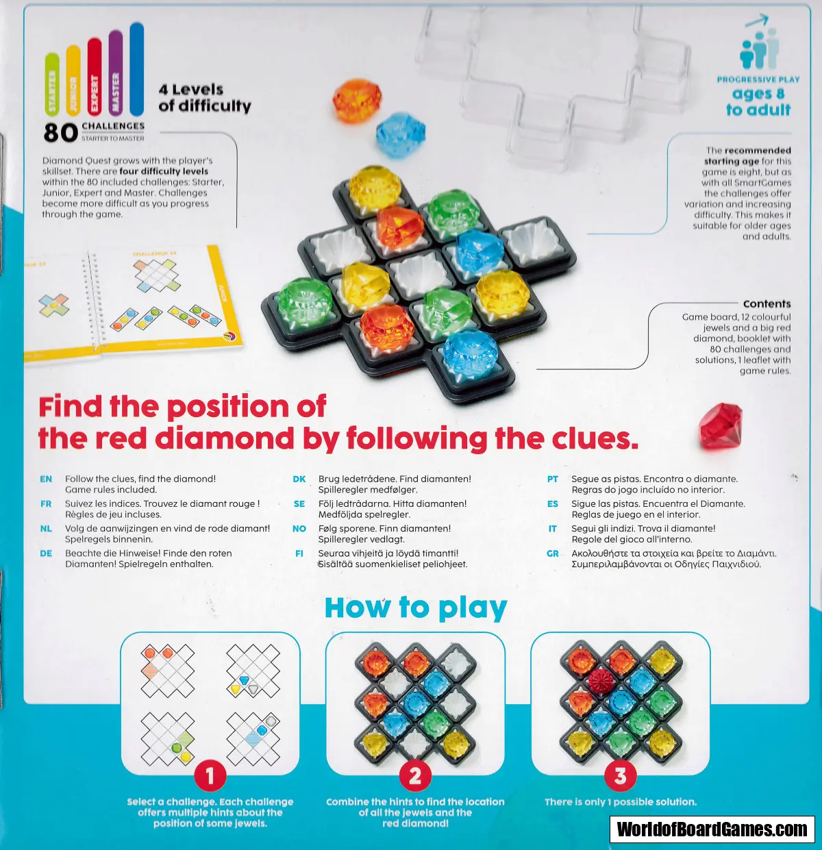Gå in i SmartGames diamantgruva och gräv fram alla juveler för att upptäcka den röda diamantens plats. Använd de ledtrådar och tips som ges i varje utmaning för att hjälpa dig. Ju djupare du gräver, desto mer sätts dina slutledningsförmågor på prov!