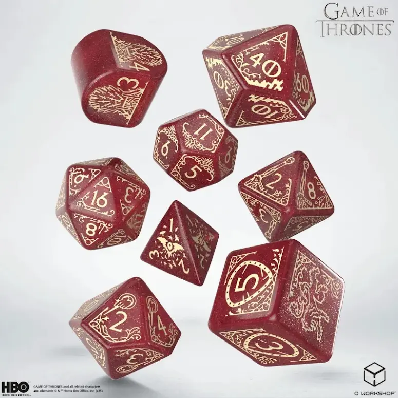 This officially licensed dice set embodies the prestige of House Lannister, with shimmering red dice and bright yellow engravings reflecting its noble banner. The design features the roaring lion sigil, the Hand of the King’s brooch, and other emblems of power and wealth. A tribute to one of the most influential houses, perfect for fans who appreciate both strategy and grandeur.