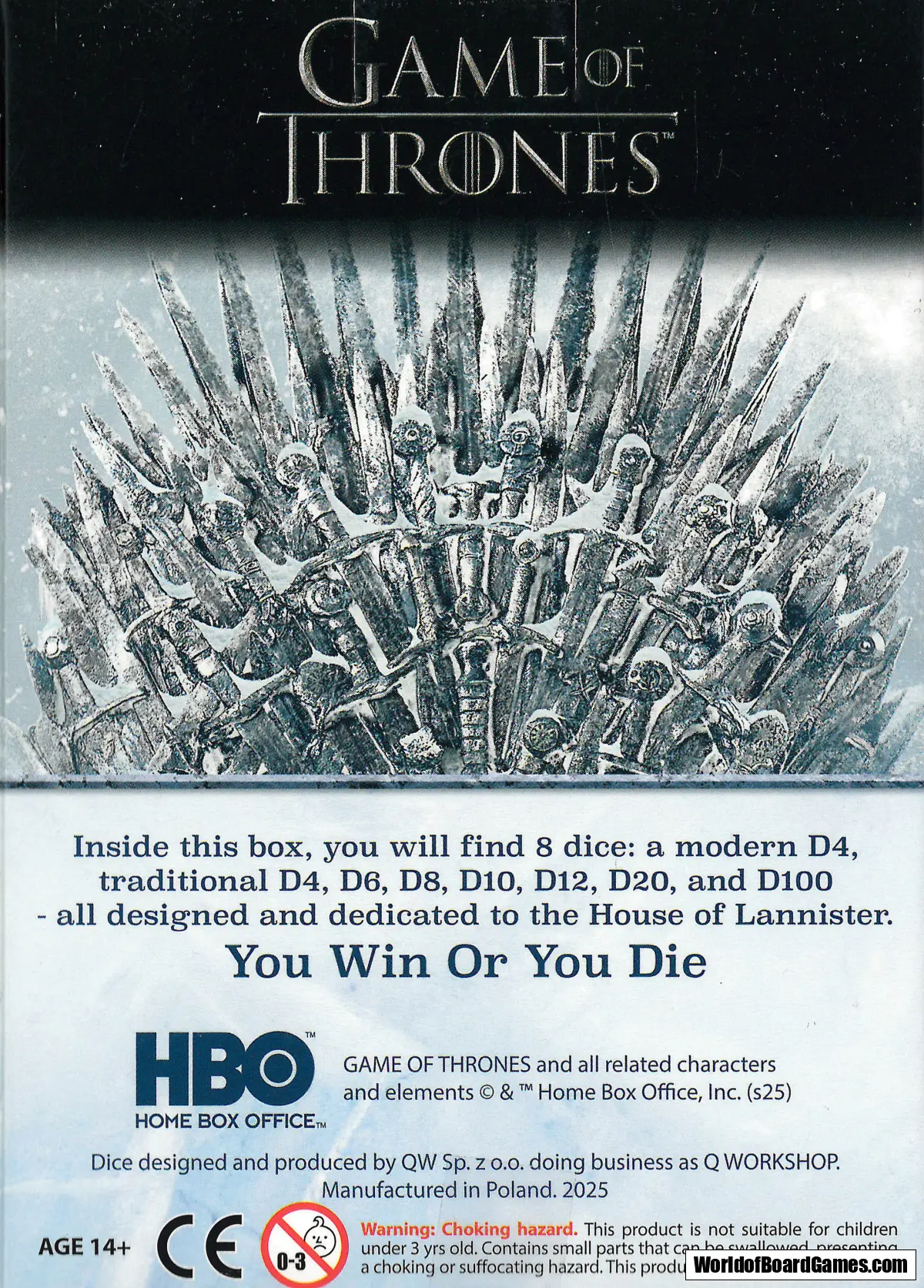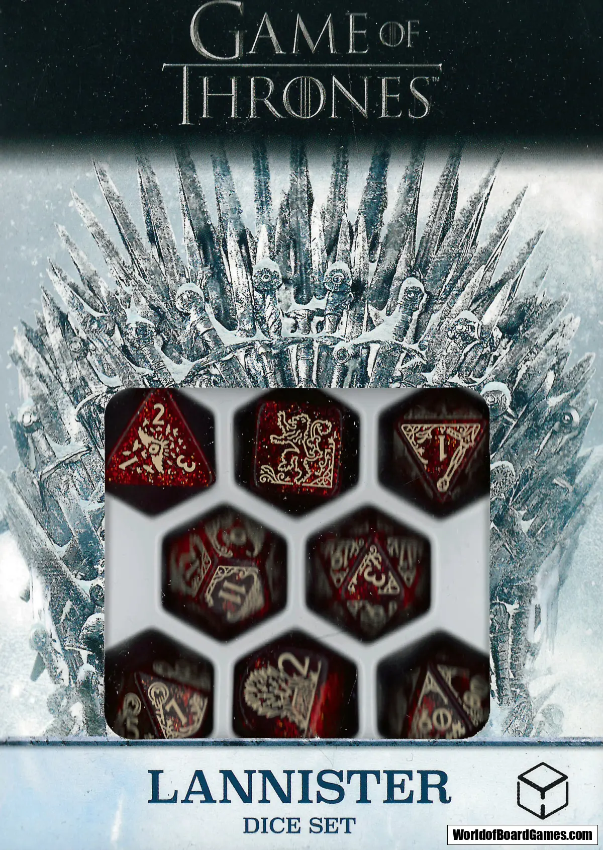 The Markings of Lannisters – The highest value faces of each dice feature markings known to the GoT fans: the iconic lion sigil, the Hand of the King’s brooch, Casterly Rock, and the words Hear Me Roar!