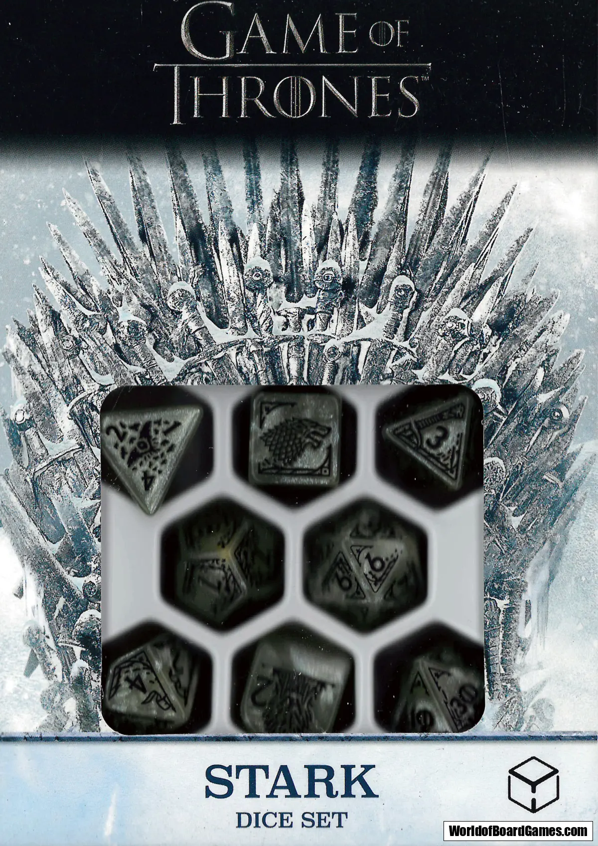 The Markings of Starks – The highest value faces of each dice feature the direwolf sigil, Winterfell, weirwood tree, battle flags, the house motto, and Jon Snow’s sword.