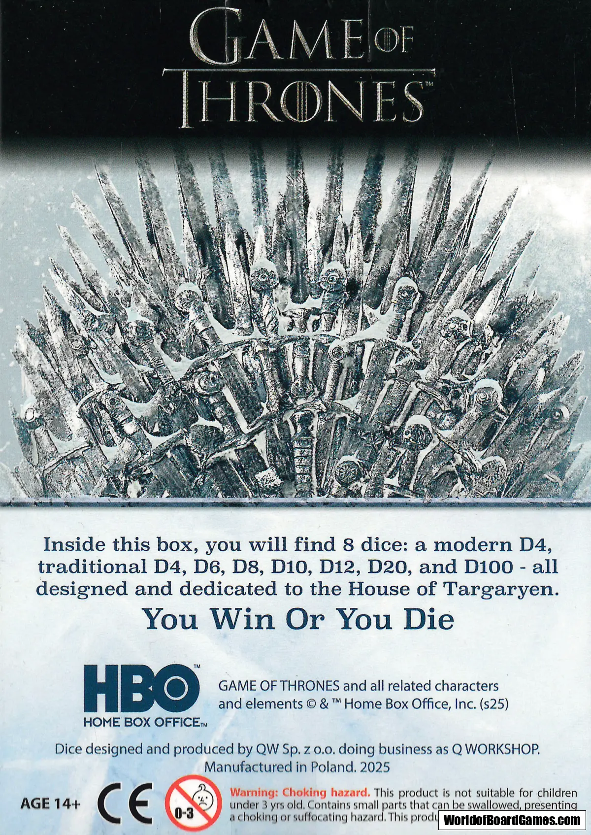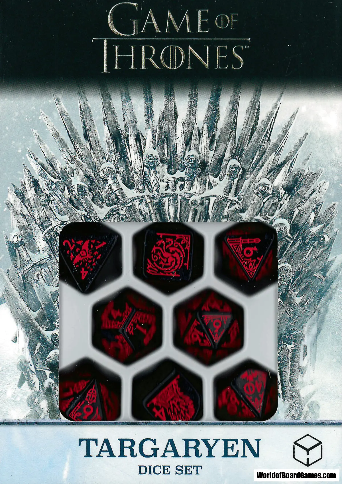 The Markings of Targaryen – The highest value faces of each dice feature the three-headed dragon sigil, Casterly Rock, regal crown, the house motto, fire and dragon wings.