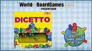 Dicetto tärningsspel kombinerar taktik och tur på ett kul och spännande sätt! Slå dina tärningar med upp till två omkast och försök att matcha resultatet mot något av de Dicetto-kort som ligger framme. Om dina tärningar ligger kvar en hel spelrunda tills det blir din tur igen så vinner du kortet och dess poäng! Men du och dina motspelare kan alltid bestrida någon annans tärningskombination som ligger på ett kort, genom att lyckas få en högre kombination av prickar på tärningarna!