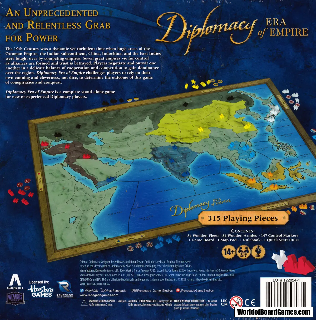 Step into the heart of 19th-century global politics with Diplomacy: Era of Empire. Set in an age of intense imperialism, this game challenges players to assume control of one of seven great empires: Britain, France, Russia, Turkey, China, Japan, or the Netherlands. Navigate through a world full of shifting alliances, betrayals, and power struggles. Unlike traditional strategy games that rely on luck, Diplomacy requires your sharp mind, negotiation skills, and strategic thinking to outwit your opponents and dominate the region.