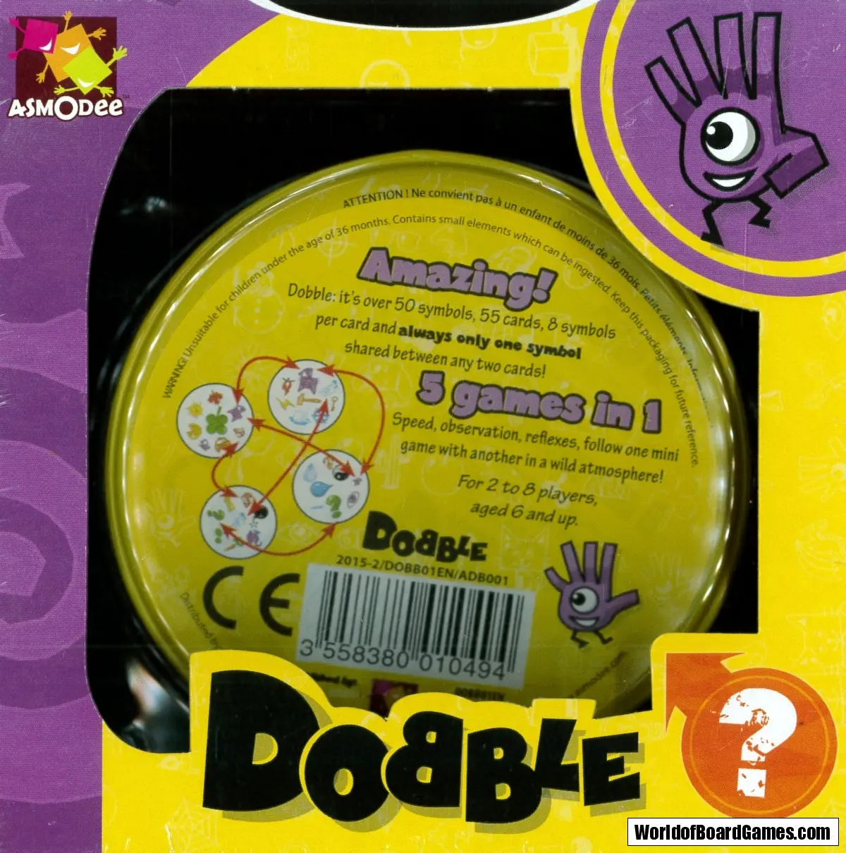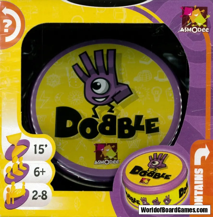 Dobble är ett enkelt och roligt kortspel där det gäller att hitta samma symbol på två olika kort. Varje kort har 8 symboler som varierar i storlek och färg, så det gäller att hålla ögonen öppna och vara skarpsint!