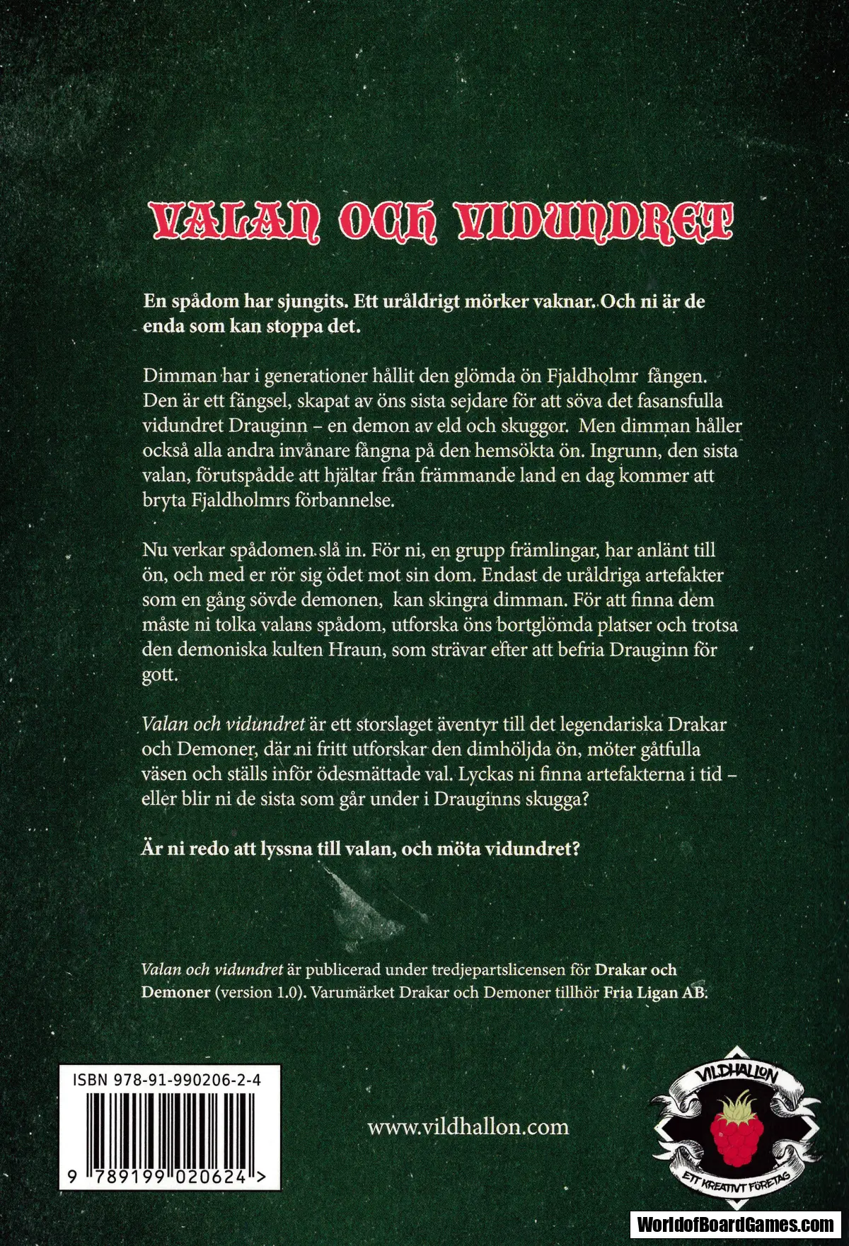 Valan och vidundret är ett storslaget äventyr till det legendariska Drakar och Demoner, där ni fritt utforskar den dimhöljda ön, möter gåtfulla väsen och ställs inför ödesmättade val. Lyckas ni finna artefakterna i tid – eller blir ni de sista som går under i Drauginns skugga? Är ni redo att lyssna till valan, och möta vidundret?