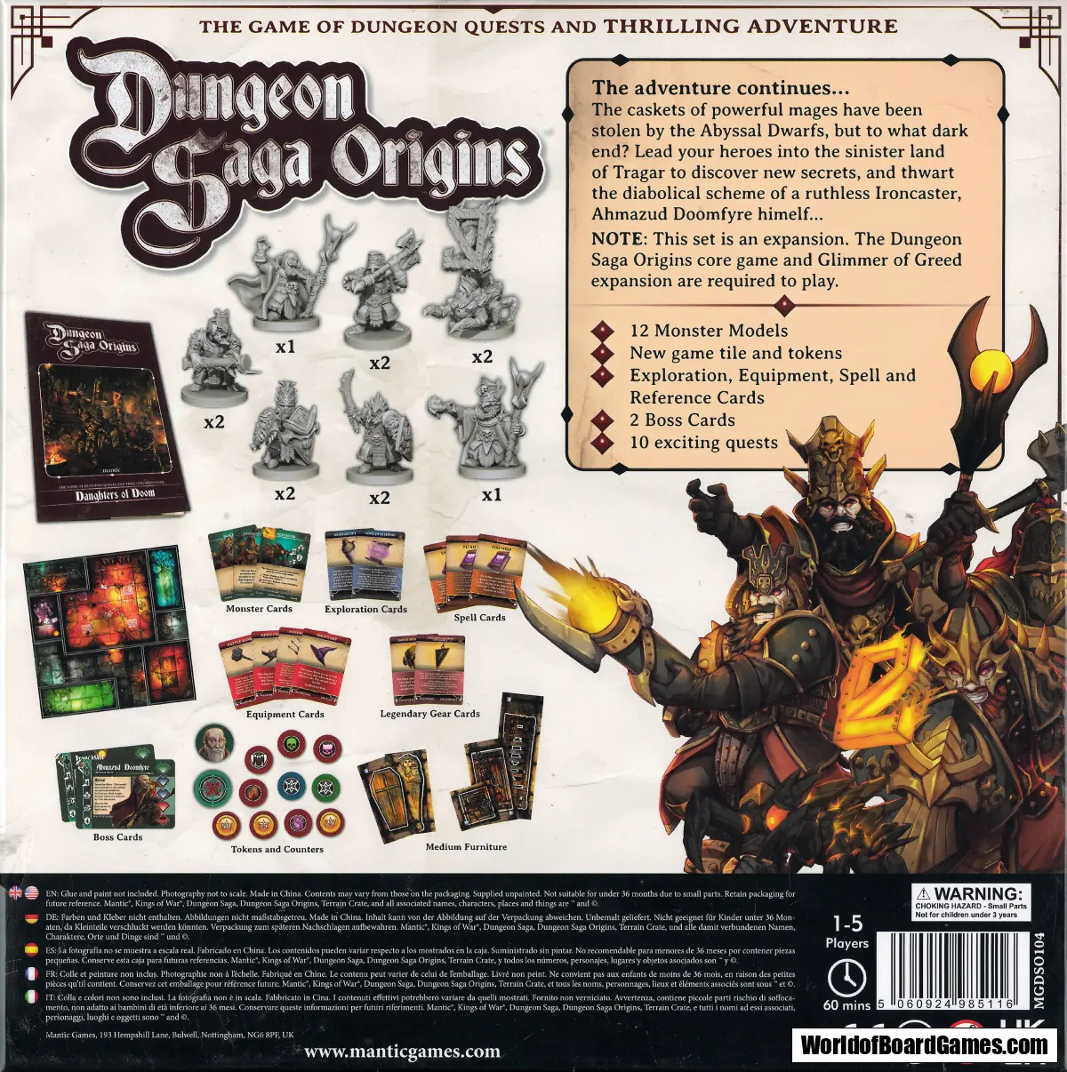 Adventure calls again! Daughters of Doom is an exciting expansion for the Dungeon Saga Origins game featuring a new story to play through that introduces a host of new enemies from the dangerous Abyssal Dwarf faction in the world of Pannithor. With a range of new components, new cards, and a sprinkling of new rules for the Overlord and Hero players alike it’s time to muster your favoured companions and best equipment for another heroic tale!